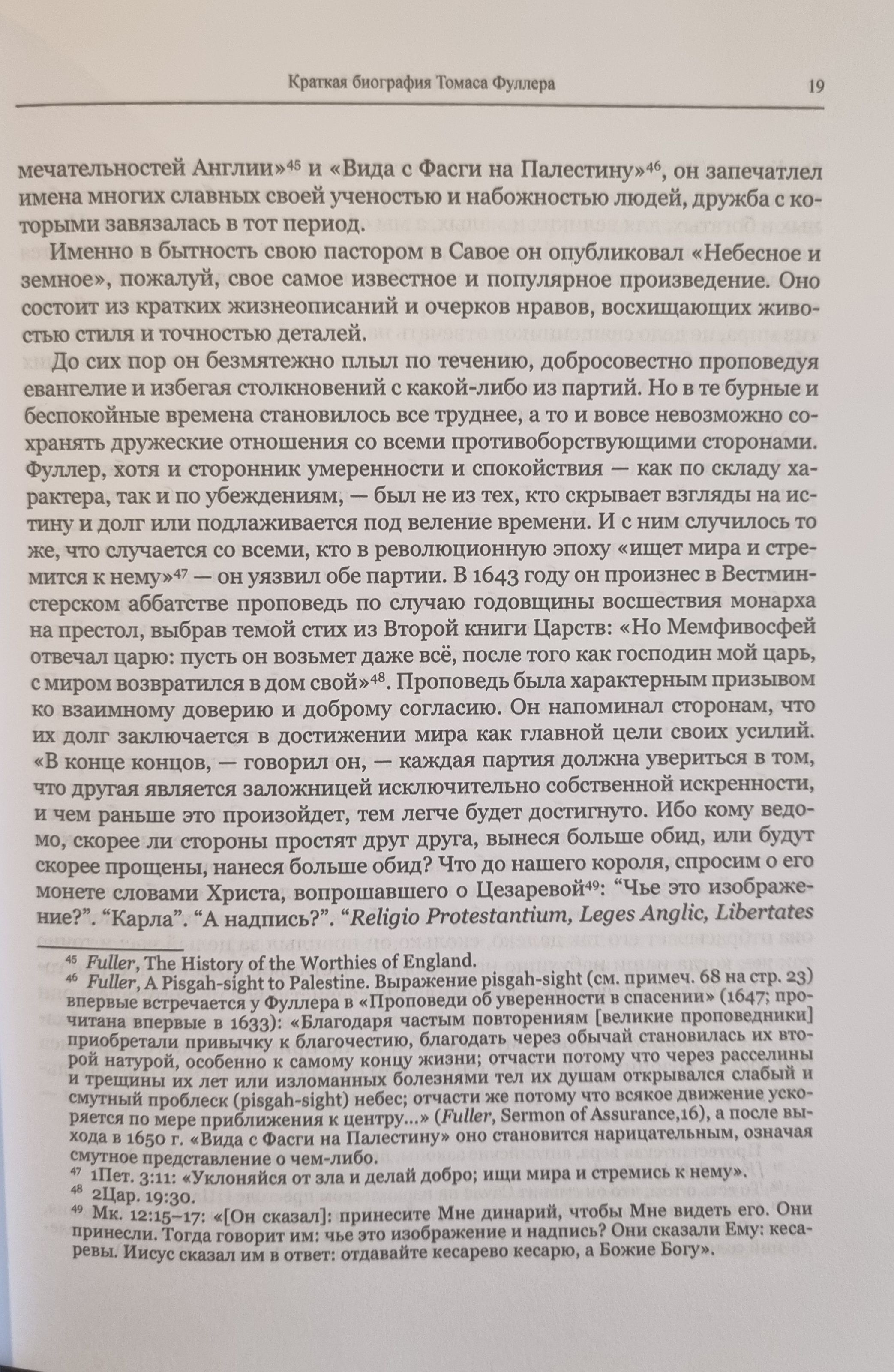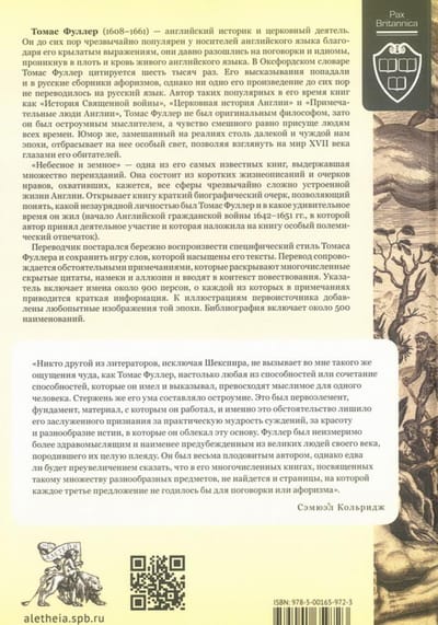 Tomass Fullers (1608–1661) bija angļu vēsturnieks un baznīcas darbinieks. Viņš joprojām ir ārkārtīgi populārs angliski runājošo vidū, pateicoties saviem moto, kas ir kļuvuši par sakāmvārdiem un idiomām, iekļūstot dzīvās valodas miesā. Tomass Fullers ir citēts sešus tūkstošus reižu Oksfordas vārdnīcā. Viņa teicieni tika iekļauti krievu aforismu krājumos, taču neviens no viņa darbiem līdz pat šai dienai nav tulkots krievu valodā. Tādu sava laika populāru grāmatu kā "Svētā kara vēsture", "Anglijas baznīcas vēsture" un "Ievērojami Anglijas cilvēki" autors Tomass Fullers nebija oriģināls filozofs, taču viņš bija asprātīgs domātājs, un humora izjūta ir tikpat raksturīga visu laiku cilvēkiem. Humors, sajaukts ar tik tāla un sveša laikmeta realitāti, rada īpašu gaismu, ļaujot mums paskatīties uz 17. gadsimta pasauli caur tās iedzīvotāju acīm. "Debesu un zemes" ir viena no viņa populārākajām grāmatām, kas ir daudzkārt pārpublicēta. Tā sastāv no īsām biogrāfijām un morāles skicēm, kas, šķiet, aptver visas Anglijas ārkārtīgi sarežģītās dzīves sfēras. Grāmata sākas ar īsu biogrāfisku skici, kas ļauj spriest par to, cik ārkārtēja persona bija Tomass Fullers un cik apbrīnojamā laikā viņš dzīvoja (autors aktīvi piedalījās Anglijas pilsoņu karā no 1642. līdz 1651. gadam, kas atstāja īpašu polemisku nospiedumu grāmatā).