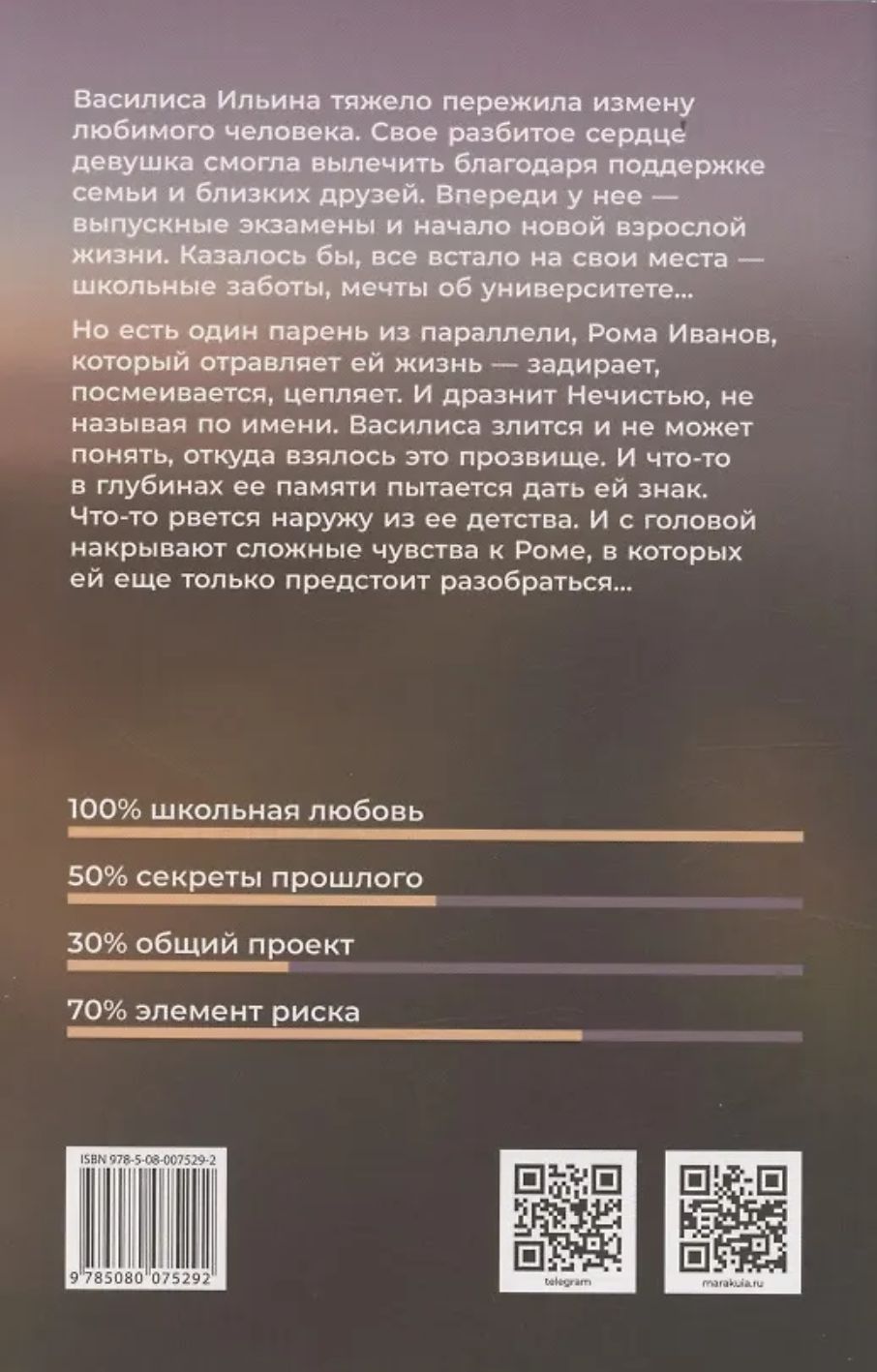 Vasilisa Iļjina ļoti cieta pēc tam, kad viņu nodeva mīļotais. Pateicoties ģimenes un tuvu draugu atbalstam, viņai izdevās dziedēt salauzto sirdi. Viņas priekšā ir noslēguma eksāmeni un jaunas pieaugušo dzīves sākums. Šķiet, ka viss ir nostājies savās vietās – raizes par skolu, sapņi par universitāti… Taču viņas klasē ir viens zēns, Roma Ivanovs, kurš padara viņas dzīvi nelaimīgu – ņirgājas, izsmej un ķircina viņu. Viņš pat sauc viņu par “Nešķīsto”, nesaucot viņu vārdā. Vasilisa ir nikna un nespēj saprast šīs iesaukas izcelsmi. Un kaut kas dziļi viņas atmiņā mēģina viņai to signalizēt. Kaut kas no viņas bērnības laužas ārā. Un viņu pārņem sarežģītas jūtas pret Romu, kuras viņa vēl nav izdomājusi…