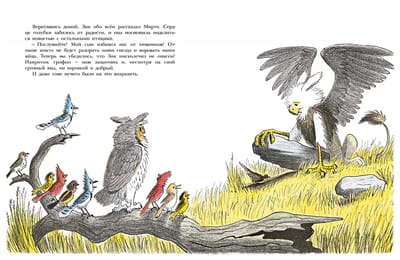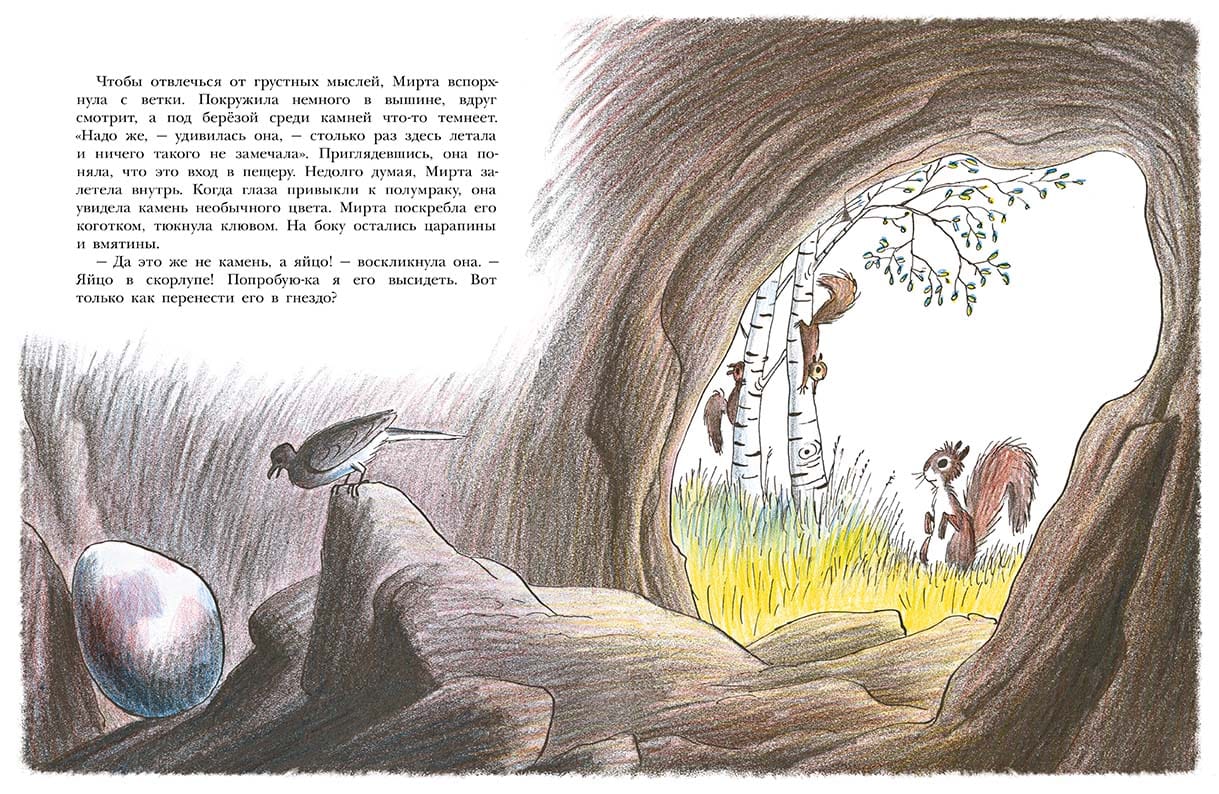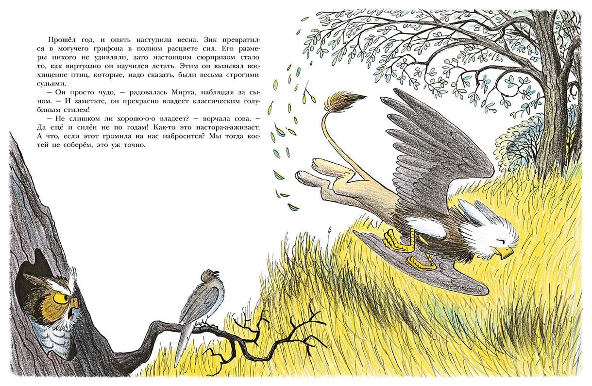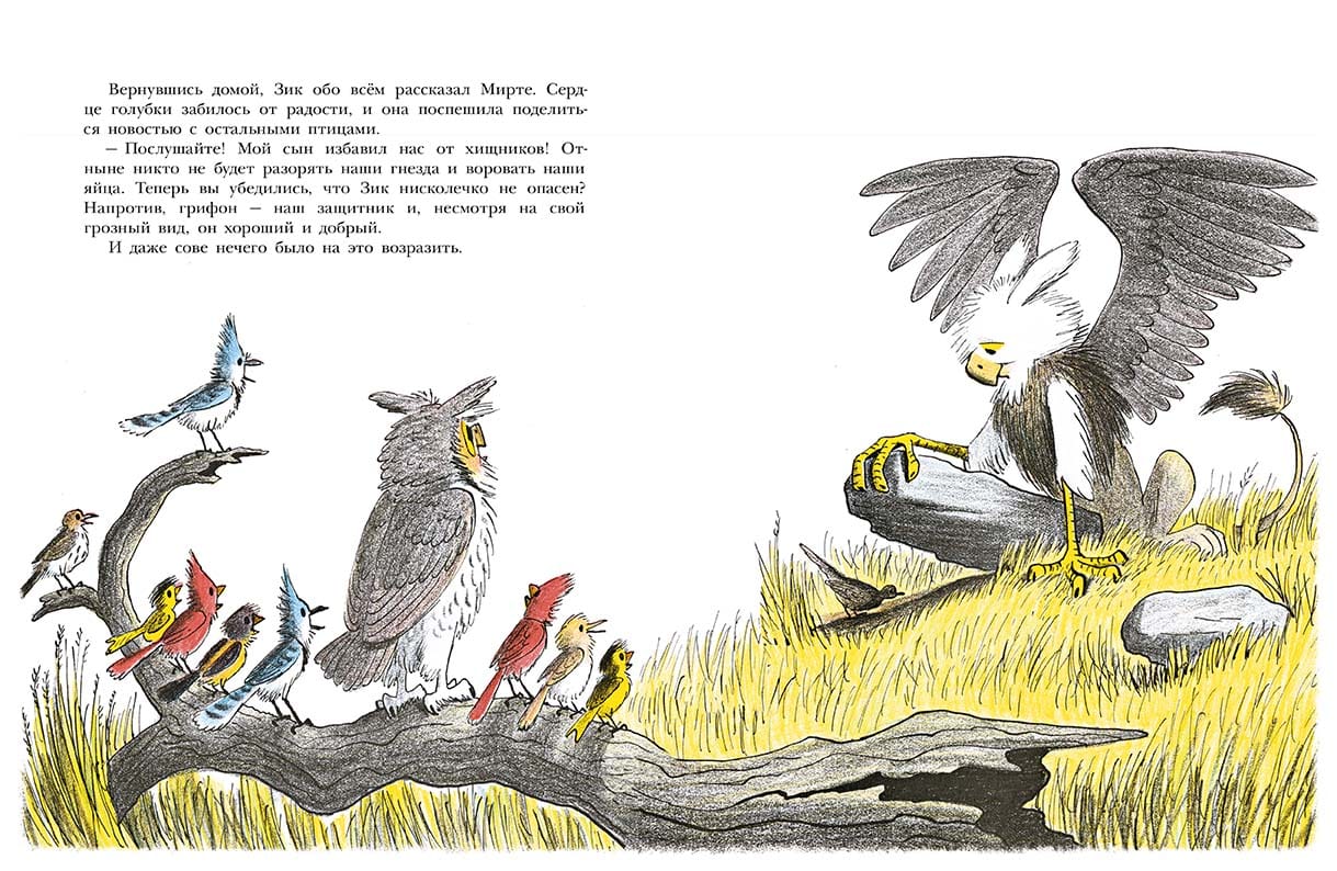 Balodis Mirta alā atrod neparastu olu un nolemj to izperēt. Par šausmām visai putnu sabiedrībai, no olas izšķiļas grifēns - pa pusei ērglis, pa pusei lauva. Vecā pūce uzskata, ka viņiem pēc iespējas ātrāk jāatbrīvojas no šī dīvainīša, citādi viņiem visiem būs nepatikšanas. Taču Mirtas aizstāv mazuli un labprāt uzņemas viņa audzināšanu. Pēc gada nobriedušais grifs glābj putnus no plēsīgiem vilkiem un lapsām. Pasaka par to, ka jauns un neparasts nenozīmē slikts. Un nevajadzētu smieties par to, kurš atšķiras no pārējiem. Šo pasaku sarakstījis un uzzīmējis Bils Pīts (Bill Peet, 1915-2002), slavens amerikāņu mākslinieks, scenārists un rakstnieks, kura grāmatas vairāk nekā pusgadsimtu izdotas dažādās valodās. Pirms kļuva par rakstnieku, Bils Pīts ilgus gadus strādāja par animatoru Volta Disneja studijā un piedalījās tādu leģendāru pilnmetrāžas animācijas filmu tapšanā kā "Sniegbaltīte un septiņi rūķīši", "Alise Brīnumzemē", "Pīters Pens" un daudzas citas.
