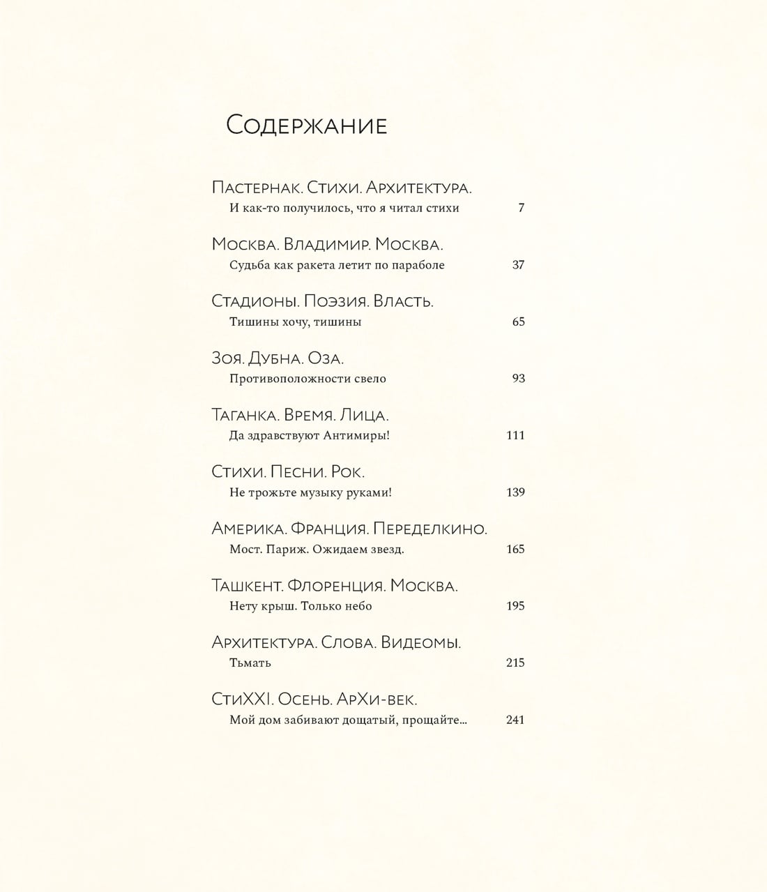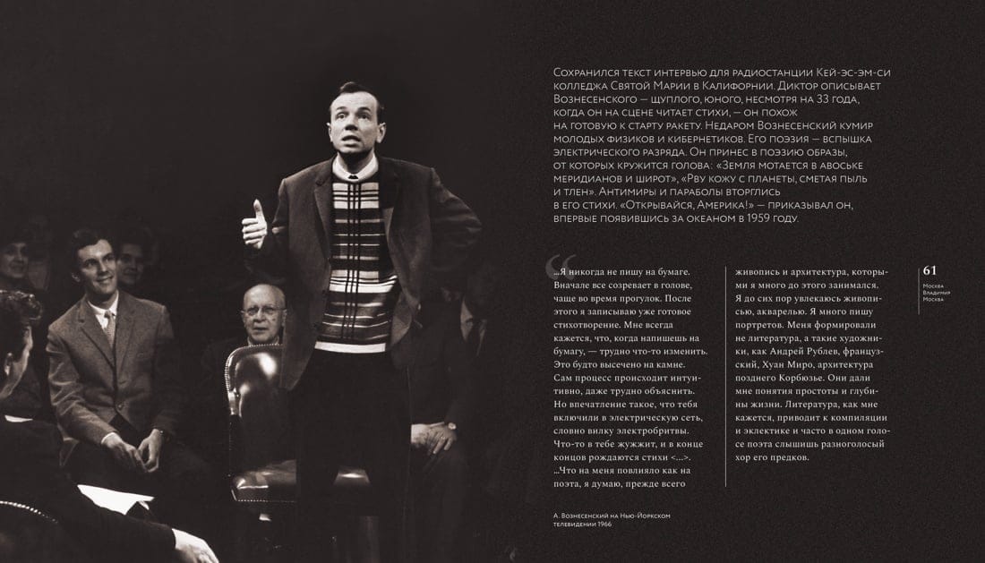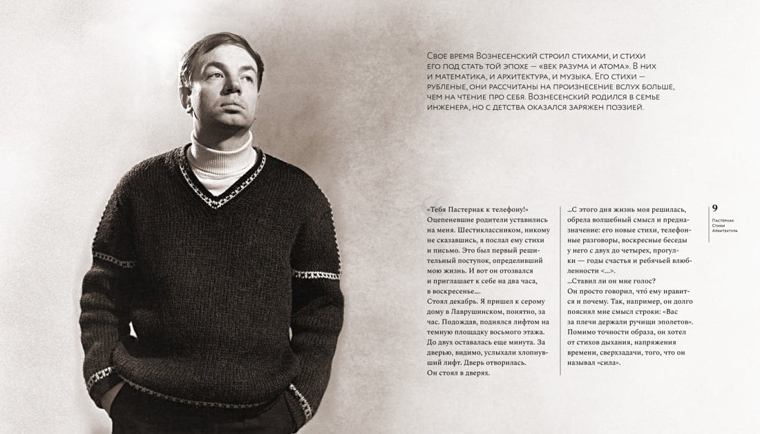 The book is a chronicle of the life of Andrei Voznesensky and the life of the entire twentyth century in poems and photographs, in prose and documents, many of which is published for the first time.