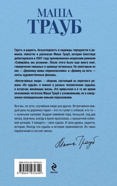 Vai nejaušas tikšanās var ietekmēt likteni? Vai svešinieks var likt jums aizdomāties par savu lēmumu pareizību? Noteikti jā, un Mašas Traubas jaunā grāmata "Nejauši cilvēki", kas sastāv no romāna "Pēc likteņa" un īsiem stāstiem par dažādiem cilvēku likteņiem, ir tam pierādījums. Šīs grāmatas varoņi - visparastākie cilvēki ar saviem priekiem un bēdām. Taču reiz katra no viņiem dzīvē ir kāds, kaut arī neliels notikums, kas daudz ko, ja ne visus, maina viņu priekšstatos par savu likteni. Un izrādās, ka varoņu likteņos nav nejaušu cilvēku - tie visi nav nejauši. Mašas Traubas proza ir terapeitiska lasāmviela: katrs grāmatas varoņos var atpazīt sevi un savus apstākļus un saprast, ka visu var labot.