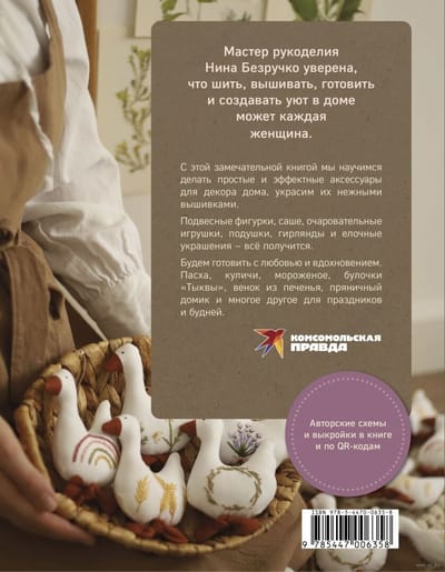 Mākslas meistare Nina Bezručko ir pārliecināta, ka katra sieviete var šūt, izšūt, gatavot un radīt mājīgu mājokli. Ar šo brīnišķīgo grāmatu mēs iemācīsimies izgatavot vienkāršus un efektīgus aksesuārus mājas dekoram un izrotāt tos ar smalkiem izšuvumiem. Piekarinātas figūriņas, maisiņi, burvīgas rotaļlietas, spilveni, virtenes un eglīšu rotājumi - viss izdosies. Gatavosim ar mīlestību un iedvesmu. Lieldienas, kuliči, saldējums, ķirbju maizītes, cepumu vainags, piparkūku namiņš un daudz kas cits svētkiem un ikdienai.