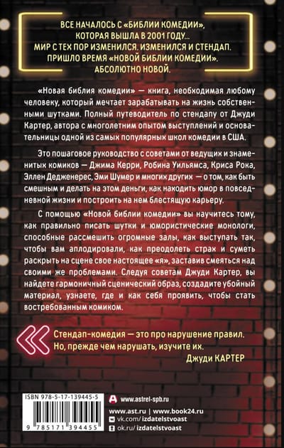 Jaunā komēdija Bībele ir obligāti jāizlasa ikvienam, kurš vēlas nopelnīt iztiku no saviem jokiem. Galīgais stand-up komēdijas ceļvedis no Džūdijas Kārteres, autores ar daudzu gadu uzstāšanās pieredzi un vienas no populārākajām komēdijas skolām Amerikas Savienotajās Valstīs.