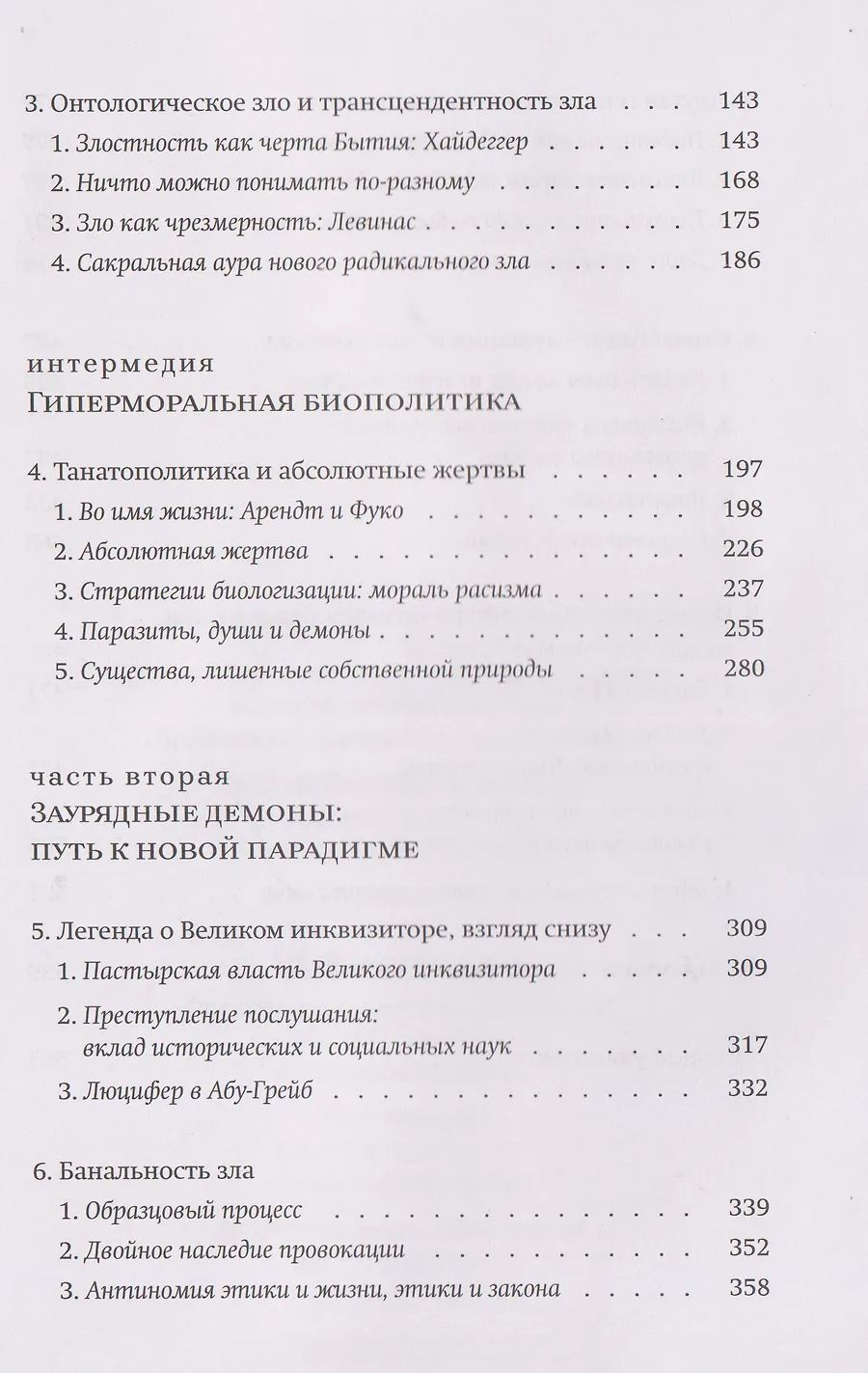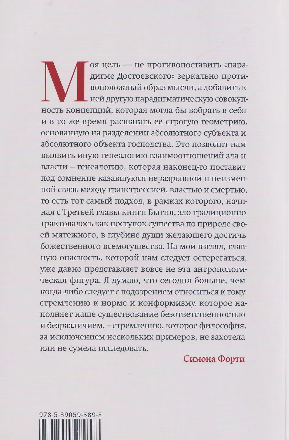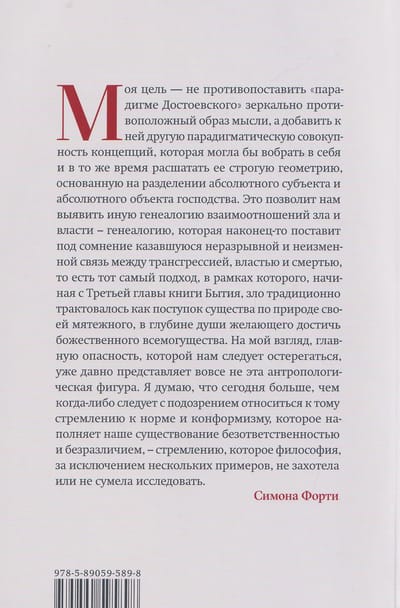 Kamēr vien mūs nodarbina ciešanas pasaulē, politiskā filozofe Simona Forti apgalvo, ka mēs esam spiesti pētīt ļaunuma jautājumu. Autore analizē 19. un 20. gadsimta filozofiskās debates par ļaunuma būtību un secina, ka mums jāatsakās no "Dostojevska paradigmas", kurā visvarens subjekts (dēmons, nāves sējējs) tiek pretstatīts bezpalīdzīgiem upuriem. Viņa piedāvā jaunu ļaunuma un varas attiecību ģenealoģiju. Forti vērš uzmanību uz pasīvo attieksmi pret noteikumu ievērošanu, nepieciešamību pēc normalitātes un vēlmi pakļauties, kas raksturīga mūsdienu demokrātijām, kas, viņasprāt, veido mūsdienu ļaunuma pamatu. Ļaunums tiek pētīts arī saistībā ar mūsu nepieciešamību izdzīvot par katru cenu un dziļu vēlmi pēc atzinības. Grāmata ir izraisījusi plašas diskusijas, piedāvājot jaunus ceļus ētikas un politikas attiecību izpētei.