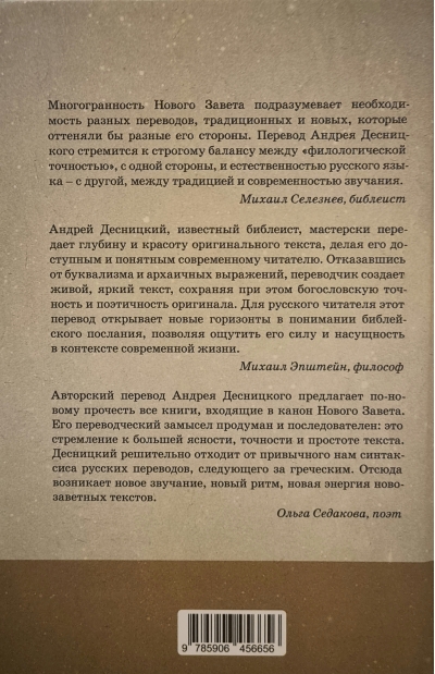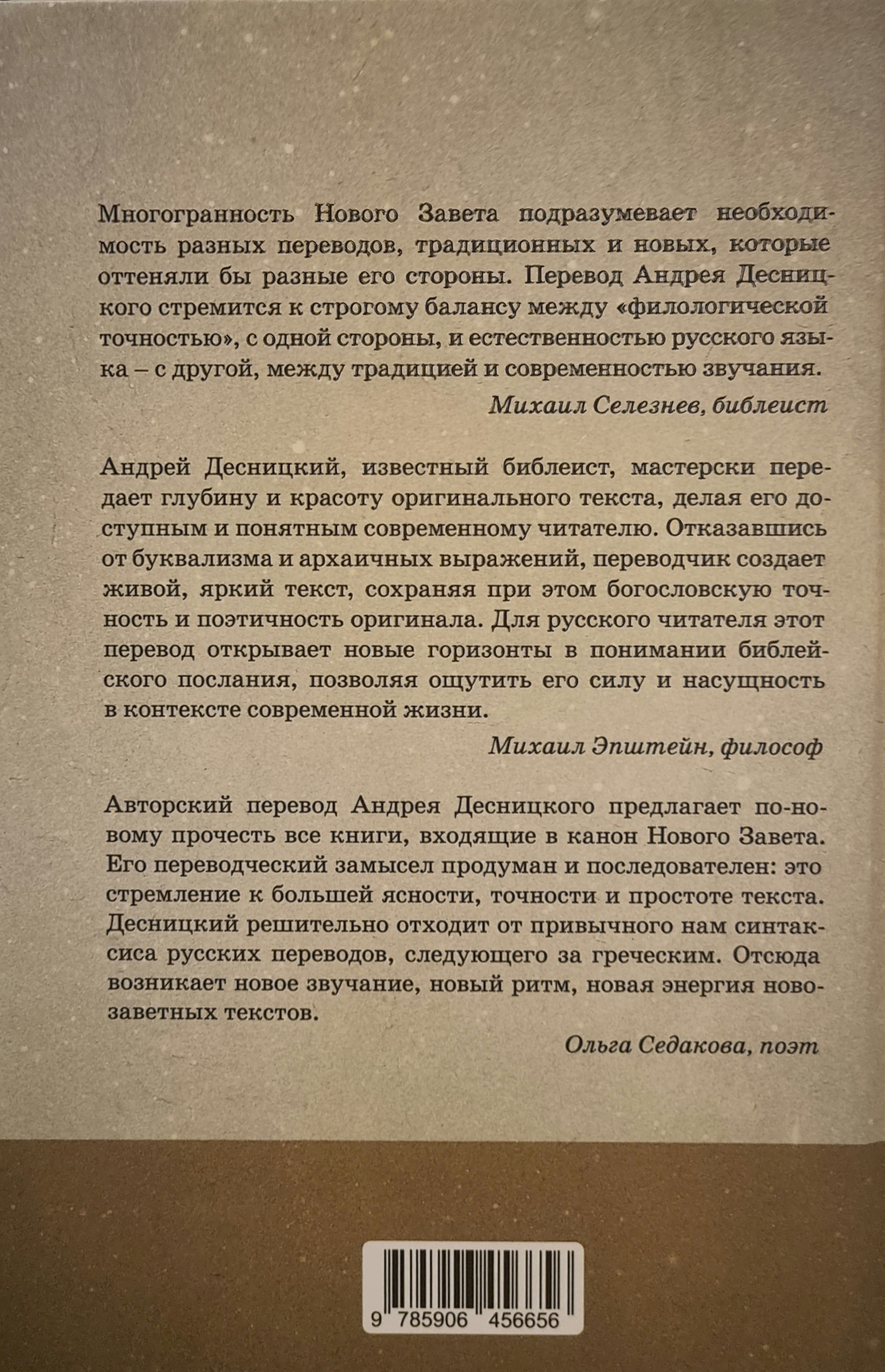 Jaunās Derības tulkojums ar īsiem komentāriem, ko veicis slavenais krievu bibliķis A. Desņickis, no vienas puses, saglabā tradīciju nepārtrauktību (īpaši terminoloģijā), no otras puses, cenšas mūsdienu krievu valodā atspoguļot oriģināla dinamismu, retorisko piesātinājumu un stilistisko daudzveidību. Tās galvenais princips ir nevis kopēt grieķu sintaksi, bet atrast mūsdienu krievu konstrukcijās, kas piemērotas oriģināla domas un stila atspoguļošanai. Īpaši tas attiecas uz Epistlu, kas veido 21 no 27 Jaunās Derības grāmatām.