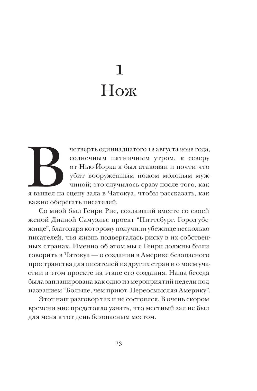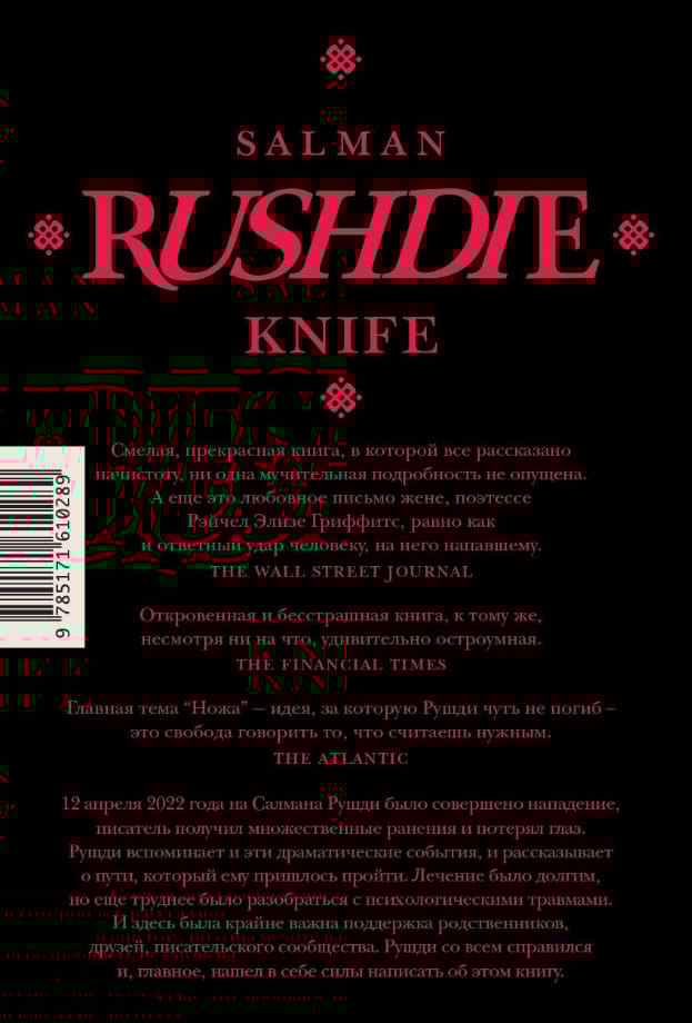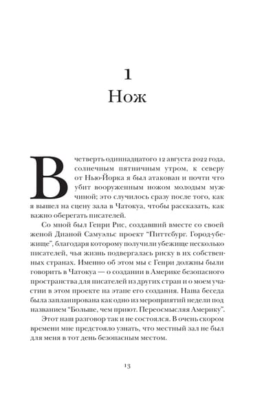 2022. gada 12. augustā Salmans Rushdijs Čatokvā (Ņujorka) gatavojās uzstāties ar lekciju par to, cik bīstama var būt rakstnieka dzīve. Rushdie uzbruka cilvēks, kurš uzlēca uz skatuves un dūra viņu vairākas reizes. Uzbrucēju apcietināja un Rushdie steidza uz slimnīcu. Sekoja ilgi ārstēšanas mēneši, un pēc tam atveseļošanās pēc psiholoģiskās traumas. Bet Rushdie atrada spēku ne tikai izturēt visus pārbaudījumus, bet arī uzrakstīt patiesu un drosmīgu grāmatu par to. Jā, radinieku un citu rakstnieku atbalsts viņam bija ļoti svarīgs, bet pats galvenais, viņš atkal aizstāvēja tiesības rakstīt un runāt par to, kas viņam bija svarīgs.