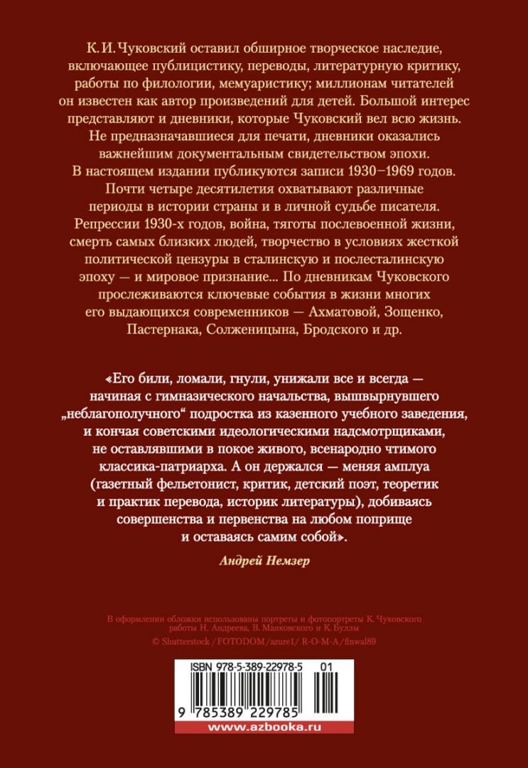 K. I. Čukovskis ir atstājis plašu radošo mantojumu - publicistiku, tulkojumus, literatūras kritiku, filoloģijas darbus, memuārliteratūru; miljoniem lasītāju viņš ir pazīstams kā darbu bērniem autors. Lielu interesi izraisa arī Čukovska dienasgrāmatas, kuras viņš rakstīja visu mūžu. Šajā izdevumā publicēti ieraksti no 1930. līdz 1969. gadam. Gandrīz četras desmitgades aptver dažādus valsts vēstures un rakstnieka personīgā likteņa periodus. Represijas 20. gadsimta 30. gados, karš, pēckara dzīves grūtības, tuvāko cilvēku nāve, jaunrade stingras politiskās cenzūras apstākļos staļinisma un pēcstaļinisma laikmetā - un pasaules atzinība… Čukovska dienasgrāmatās izsekoti galvenie notikumi daudzu viņa izcilo laikabiedru - Ahmatovas, Zoščenko, Pasternāka, Solžeņicina, Brodska un citu - dzīvē.