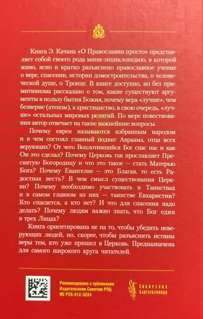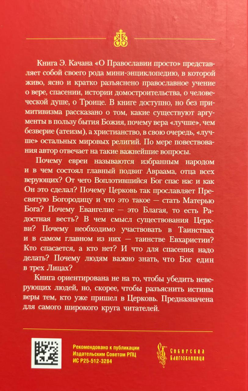 E. Kačana grāmata "Vienkāršota pareizticība" ir sava veida mini enciklopēdija, kas spilgti, skaidri un kodolīgi izskaidro pareizticīgo mācību par ticību, pestīšanu, ekonomikas vēsturi, cilvēka dvēseli un Trīsvienību. Pieejami, tomēr ne pārāk vienkāršoti, grāmata izskaidro Dieva eksistences argumentus, kāpēc ticība ir labāka par neticību (ateismu) un kāpēc kristietība, savukārt, ir labāka par citām pasaules reliģijām. Pa ceļam autors atbild uz daudziem svarīgiem jautājumiem. Kāpēc ebrejus sauc par izredzēto tautu, un kāds bija Ābrahāma, visu ticīgo tēva, galvenais varoņdarbs? No kā mūs izglāba Iemiesotais Dievs un kā Viņš to izdarīja? Kāpēc Baznīca tik ļoti godina Vissvētāko Dievmāti un ko nozīmē kļūt par Dievmāti? Kāpēc Evaņģēlijs ir labā vēsts, tas ir, priecīga vēsts? Kāda ir Baznīcas eksistences jēga? Kāpēc ir nepieciešams piedalīties sakramentos un vissvarīgākajā no tiem – Euharistijas sakramentā? Kas ir izglābts un kas nav? Un kas jādara, lai sasniegtu pestīšanu? Kāpēc cilvēkiem ir svarīgi zināt, ka Dievs ir viens trijās Personās? Šī grāmata nav paredzēta, lai pārliecinātu neticīgos, bet gan lai skaidrotu ticības patiesības tiem, kas jau ir nākuši pie Baznīcas. Tā ir paredzēta plašam lasītāju lokam.
