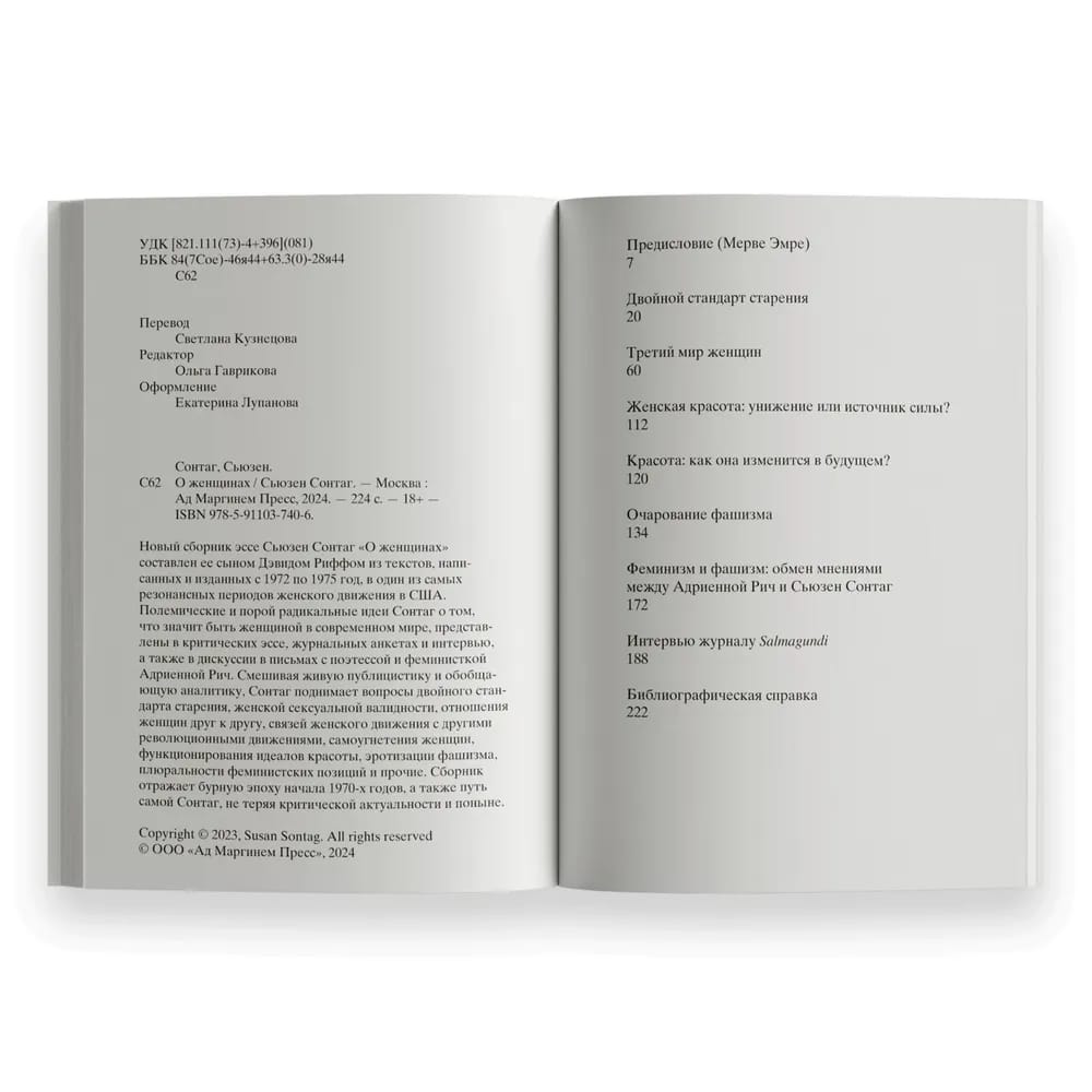 Susanas Sontāgas jaunajā eseju krājumā "Par sievietēm", ko rediģējis viņas dēls Deivids Rifs (David Rieff) un priekšvārdu sarakstījusi rakstniece un kritiķe Merve Emre (Merve Emre), apkopoti darbi, kas sarakstīti un publicēti laikā no 1972. līdz 1975. gadam - vienā no visrezonansiālākajiem sieviešu kustības periodiem Amerikas Savienotajās Valstīs. Sontāgas polemiskās un dažkārt radikālās idejas par to, ko nozīmē būt sievietei mūsdienu pasaulē, ir izklāstītas kritiskās esejās, aptaujā marksistiskam spāņu valodā iznākošam žurnālam, intervijā amerikāņu žurnālam un diskusijā ar dzejnieci un feministi Adrienne Rich. Sajaucot dzīvu publicistiku un rezumējošu analīzi, neaizmirstot citas balsis un uzrunājot auditoriju citās valstīs, Sontāga izvirza jautājumus par novecošanas dubultstandartu, sieviešu seksuālo derīgumu, sieviešu attiecībām savā starpā, sieviešu kustības saikni ar citām revolucionārām kustībām, sieviešu pašaizspiešanu, skaistuma ideālu funkcionēšanu, fašisma erotizāciju, feminisma pozīciju daudzveidību un citus. Krājums atspoguļo trauksmaino - un mums jau vēsturisko - 20. gadsimta 70. gadu sākuma laikmetu, kā arī pašas Sontāgas ceļu, nezaudējot savu kritisko aktualitāti mūsdienās.