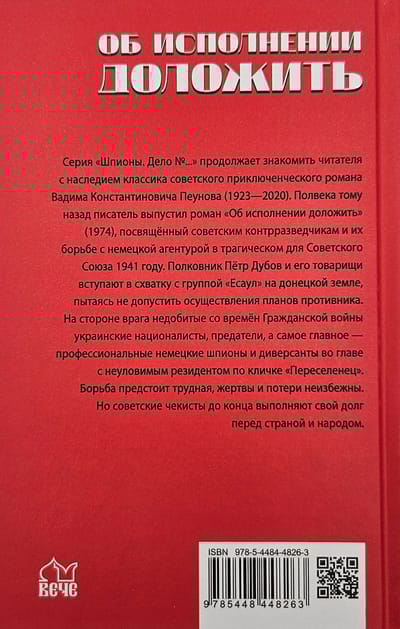 Sērija “Spiegi. Lieta Nr..." turpina iepazīstināt lasītāju ar klasiskā padomju piedzīvojumu romāna Vadima Konstantinoviča Peunova (1923-2020) mantojumu. Pirms pusgadsimta rakstnieks izdeva romānu “Ziņojums par nāvessodu” (1974), kas veltīts padomju pretizlūkošanas virsniekiem un viņu cīņai pret vācu aģentiem Padomju Savienībai traģiskajā gadā 1941. gadā. Pulkvedis Pjotrs Dubovs un viņa biedri dodas kaujā ar Esaula grupu Doņeckas teritorijā, cenšoties novērst ienaidnieka plānu īstenošanu. Ienaidnieka pusē ir ukraiņu nacionālisti, nodevēji un, pats galvenais, profesionāli vācu spiegi un diversanti, kuru vadībā ir nenotverams iedzīvotājs ar iesauku “Displaced”, kuri nav nogalināti kopš pilsoņu kara. Cīņa priekšā ir grūta, upuri un zaudējumi ir neizbēgami. Bet padomju drošības darbinieki savu pienākumu pret valsti un tautu pilda līdz galam.