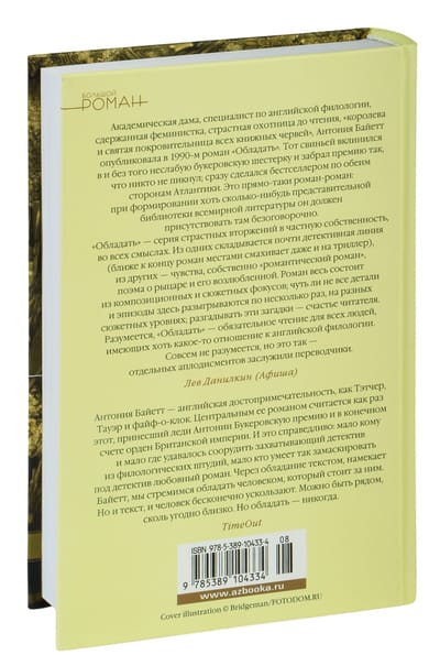 "Possession" ir izcilākais 20. gadsimta beigu angļu romāns un neapšaubāmi Antonijas Baitas izcilākais darbs. Tomēr vārdu "romāns" šai apbrīnojamajai prozai var attiecināt tikai ar grūtībām. Kas tas ir? Ideju detektīvromāns? Mūsdienīgs skatījums uz sieviešu gotisko romānu? Bruņinieku romantika ar jaunu pavērsienu? Tas viss kopā — un kaut kas vairāk, dziļi moderns darbs, kas ietver daudzas tradīcijas un vienlaikus iezīmē patiesas iedvesmas un inovācijas zīmogu. Angļu gara un angļu diženuma noslēpums mirdz tā daudzajās šķautnēs.