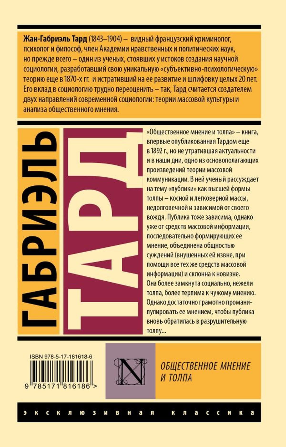 "Sabiedriskā doma un pūlis" ir grāmata, ko Tarde pirmo reizi publicēja 1892. gadā, taču tā joprojām ir aktuāla. Tas ir viens no masu komunikācijas teorijas pamatdarbiem. Tajā zinātnieks apspriež "sabiedrību" kā augstāko pūļa formu — inertu un lētticīgu masu, kas ir īslaicīga un atkarīga no sava vadītāja.