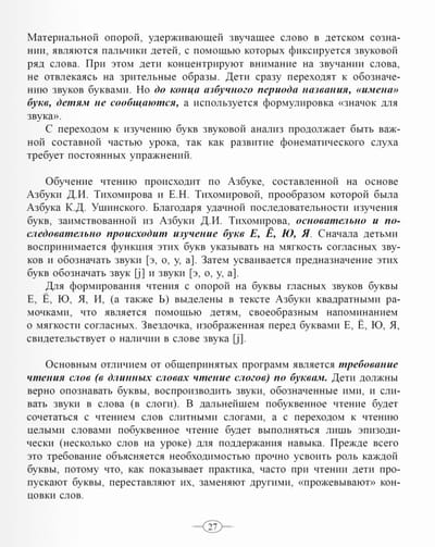 Piedāvātās rakstītprasmes mācīšanas metodes īpatnība ir aktīva bērnu fonemātiskās dzirdes attīstīšana, kas ļauj harmonizēt bērnu smadzeņu dzirdes un runas motorikas analizatoru darbību, palīdz uztvert valodas skaņu pusi, izprast skaņu nozīmes izšķirošo funkciju. Šī metode piedāvā ilgstoši mācīt lasīt vārdus pēc burtiem, lai bērni stingri apgūtu krievu rakstu pozicionēšanas principu. Pēdējā prasība ir lasīt veselus vārdus, kas atbilst ortoepiskajām normām un ļauj viņiem pilnībā izprast izlasītā nozīmi. Šo mērķu sasniegšanai palīdz detalizēti nodarbību pieraksti un metodiskie komentāri.