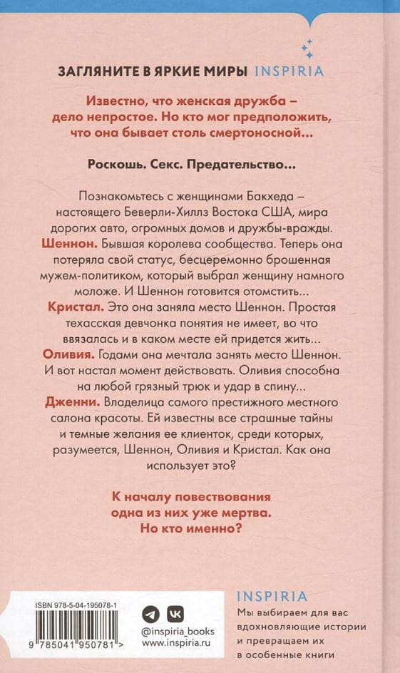 Luksusa. Sekss. Nodevība... Iepazīstieties ar Bukhedas sievietēm - īstu ASV austrumu Beverlihilzu, dārgu automašīnu, milzīgu māju un draudzības naida pasauli. Šenona. Bijusī sabiedrības karaliene. Tagad viņa ir zaudējusi savu statusu, bezceremoniju kārtā pamesta no sava vīra politiķa, kurš izvēlējies daudz jaunāku sievieti. Un Šenona gatavojas atriebties... Kristāla. Viņa ir tā, kas ieņēma Šenonas vietu. Vienkāršajai Teksasas meitenei nav ne jausmas, kādā situācijā viņa ir iekļuvusi un kādā vietā viņai nāksies dzīvot... Olīvijai. Jau gadiem ilgi viņa ir sapņojusi ieņemt Šenonas vietu. Un tagad ir pienācis laiks rīkoties. Olīvija ir spējīga uz jebkuru netīru triku un dūrienu mugurā... Dženija. Prestižākā vietējā skaistumkopšanas salona īpašniece. Viņa zina visus savu klientu, kuru vidū, protams, ir Šenona, Olīvija un Kristāla, briesmīgos noslēpumus un tumšās vēlmes. Kā viņa to izmanto? Kad stāsts sākas, viena no viņām jau ir mirusi. Bet kurš tieši?"