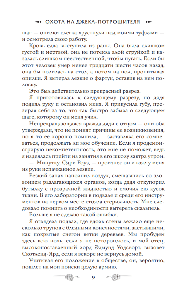 Anglija. 19. gadsimta beigas. Septiņpadsmit gadus vecā Odrija Roza Vadsvorta ir viena no ietekmīgākajiem britu lordiem meita. Taču modes kleitu un nākotnes, bez šaubām, spožas laulības vietā viņas domas nodarbina tiesu medicīna, anatomija un citas jaunai aristokrātei nepiedienīgas nodarbes. Šis “hobijs” būtu palicis noslēpums, par kuru varēja iepazīties tikai viņas tēvocis ķirurgs Džonatans Vadsvorts un viņa izcilais skolnieks Tomass Kresvels, ja vien Londonā nebūtu parādījies briesmīgais sērijveida slepkava Džeks Uzšķērdējs. Odrija Rouza apņēmīgi pievienojas izmeklēšanai, taču drīz vien sāk aizdomāties, ka maniaks slēpjas kāda viņai tuva cilvēka aizsegā. Bet kas ir šis vājprātīgais?