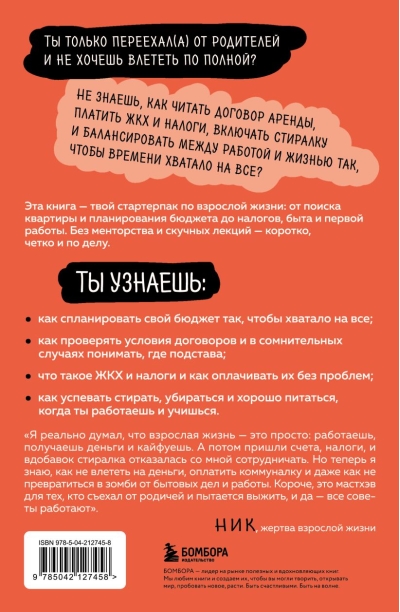 "Es godīgi domāju, ka pieaugušo dzīve ir vienkārša: strādāt, pelnīt naudu un labi pavadīt laiku. Tad nāca rēķini, nodokļi, un turklāt veļas mašīna atteicās darboties. Bet tagad es zinu, kā izvairīties no pārtērēšanas, atcerēties maksāt komunālos maksājumus un pat kā nepārvērtties par zombiju mājas darbu un darba dēļ. Īsāk sakot, šī ir obligāta grāmata ikvienam, kurš ir pametis savu ģimeni un cenšas izdzīvot, un jā, šis padoms darbojas." — Niks, pieaugušo dzīves upuris.