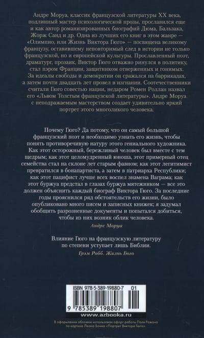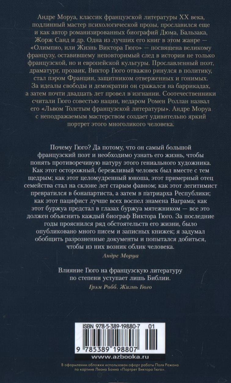 André Morois, 20. gadsimta franču literatūras klasiķis, īsts psiholoģiskās prozas meistars, kļuva slavens kā Dumas, Balzaka, Žoržas Sandas un citu autoru romānu biogrāfiju autors. Viena no viņa labākajām šī žanra grāmatām - "Olimpio, jeb Viktora Hugo dzīve" - ir veltīta izcilajam francūzim, kurš atstājis neatkārtojamu pēdas ne tikai Francijas, bet arī Eiropas kultūras vēsturē. Slavenais dzejnieks, dramaturgs, prozaiķis Viktors Hugo drosmīgi metās politikā, kļuva par Francijas līdzinieku, noraidīto un vajāto aizstāvi. Par brīvības un demokrātijas ideāliem viņš cīnījās uz barikādēm un pēc tam gandrīz divdesmit gadus pavadīja trimdā. Līdzpilsoņi uzskatīja Hugo par nācijas sirdsapziņu, ne velti Romēns Rolāns viņu dēvēja par franču literatūras "Tolstoja lauvu". Andrē Moroī ar neatkārtojamu meistarību veido pārsteidzoši spilgtu šī daudzšķautņainā cilvēka portretu.