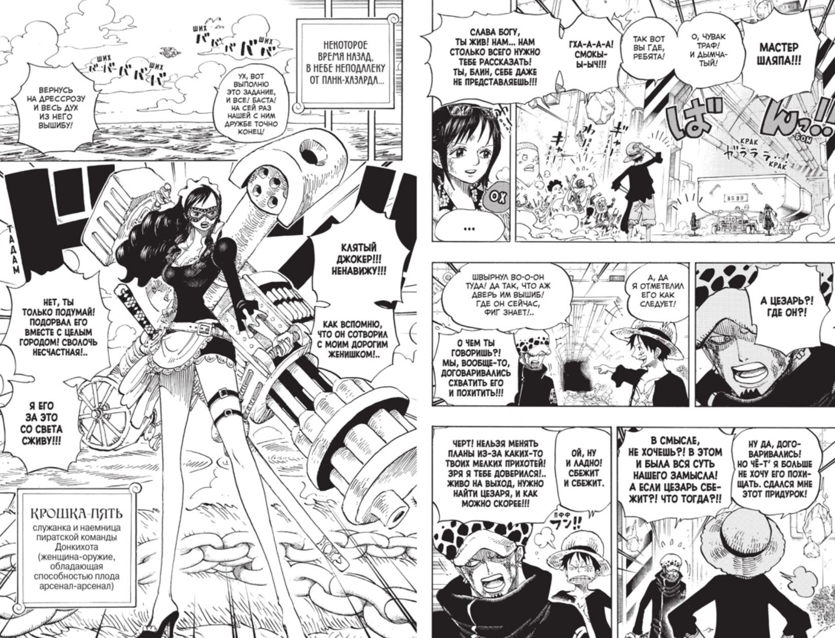 Pērtiķis D. Lafijs un Trafalgars Lo izveido aliansi, plānojot izaicināt vienu no Jūru Imperatoriem. Taču, lai īstenotu savu plānu, jaunizveidotajiem biedriem vispirms ir jānotver zinātnieks vārdā Cēzars, bez kura Lielais Korsārs Doflamingo nespēs radīt mākslīgus Velna Augļus. Iedzinuši trako ģēniju stūrī un iznīcinājuši SAD ražotni, gumijas kapteinis un viņa draugi veiksmīgi pabeidz sava plāna pirmo daļu.