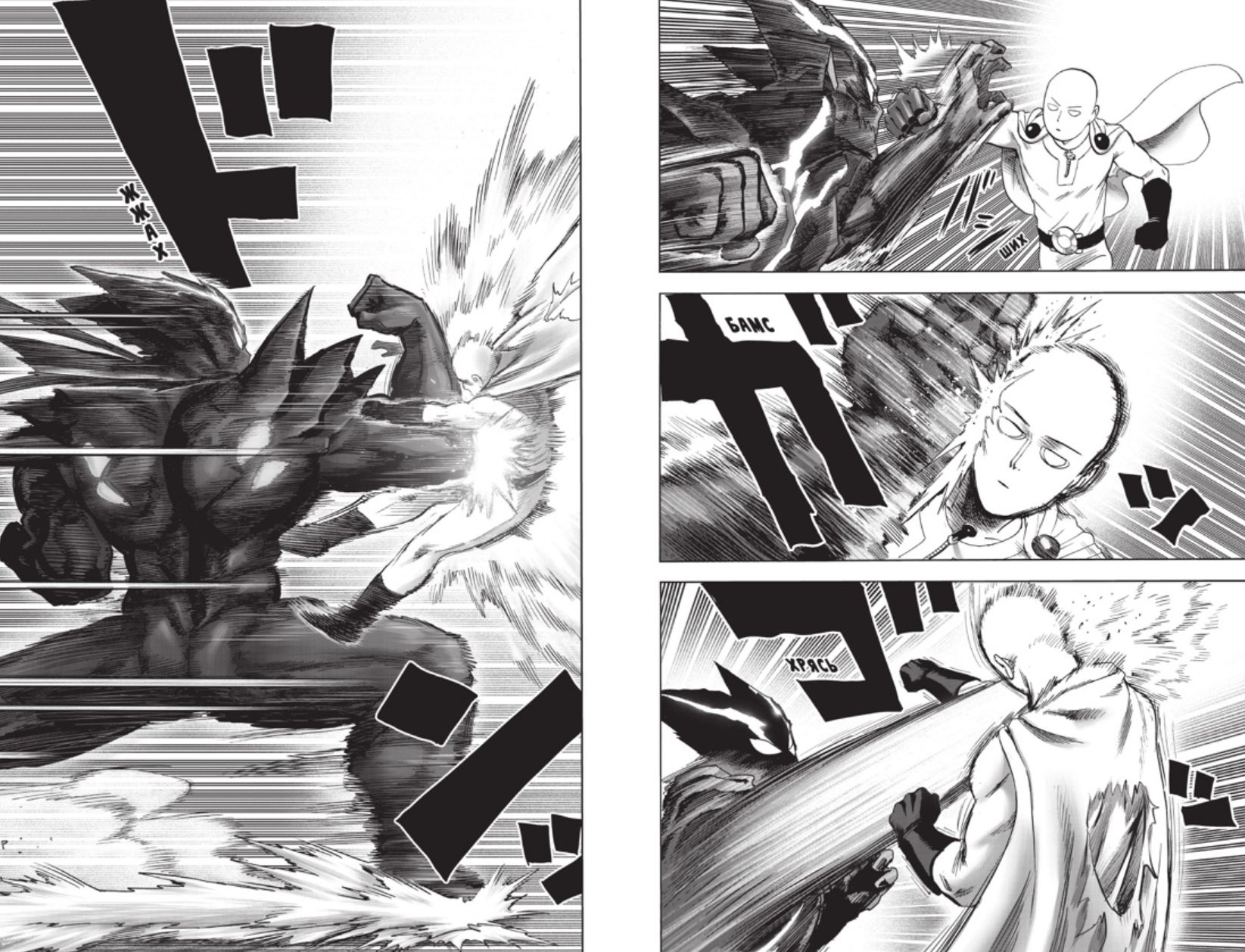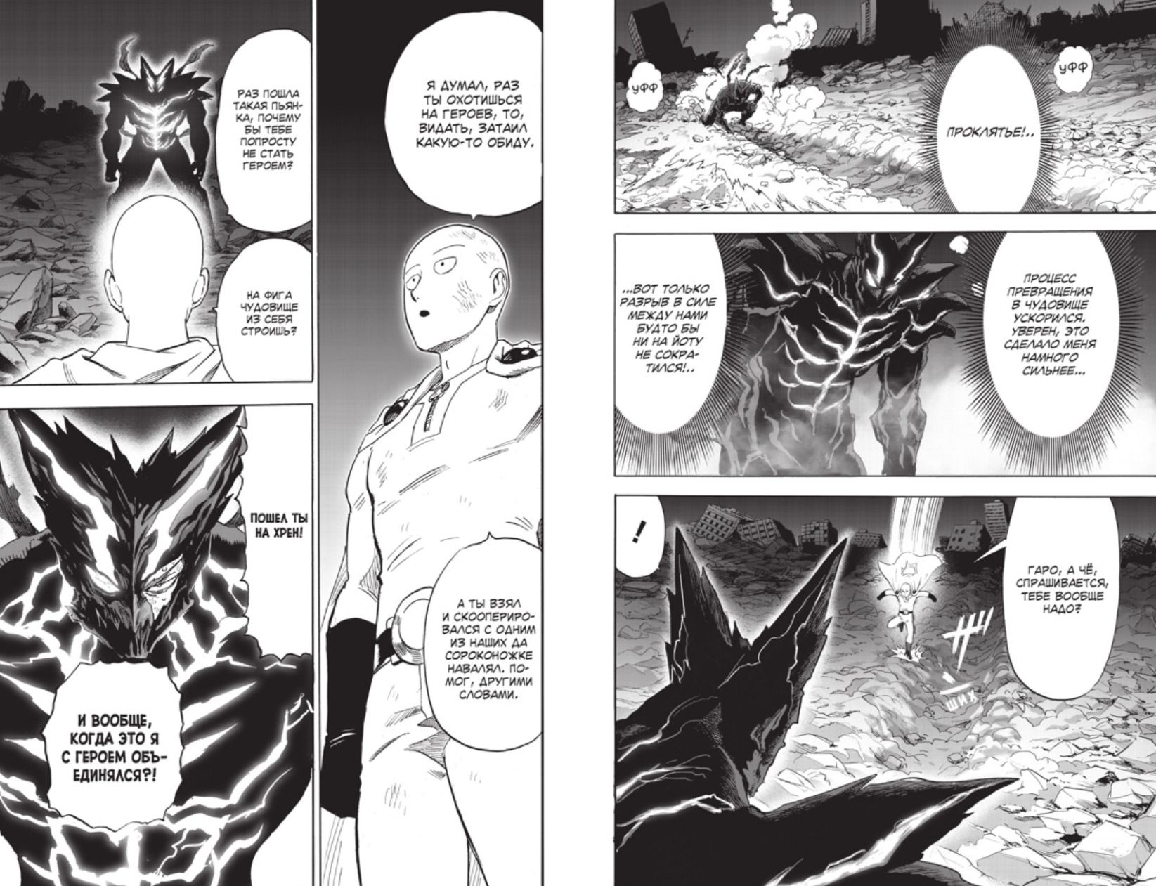 Saitama un Garo beidzot stājas aci pret aci. Saitama mudina savu pretinieku uzklausīt zēna Tareo jūtas, bet Garo ignorē Plikpaura apmetni un cenšas pēc iespējas ātrāk kļūt par briesmoni. Tomēr varoņu mednieks nespēj pārspēt Saitamu. Un tieši tad, kad Garo grasās pieņemt sakāvi, no kaut kurienes atskan balss — un Banga bijušais skolnieks pēkšņi iegūst neticamu spēku!