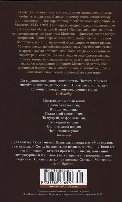 "Manas grāmatas saturs esmu es pats, kas nav nekāds iemesls, lai jūs veltītu savu brīvo laiku tik vieglprātīgam un nenozīmīgam tematam," tā savu darbu raksturo Mišels Montēns (1533-1592). Taču cilvēki vēl šodien ar prieku lasa viņa "Eksperimentus". Kāpēc? Acīmredzot tieši tāpēc, ka pats Montēns - filozofs, intelektuālis, asprātīgais - joprojām ir aktuāls. Kāds mūsdienu autors viņu nosauca par "tipisku blogeri", un šajā iejūtīgajā formulējumā ir daudz patiesības. Monteņs rakstīja, kā viņš pats saka, tuviniekiem, ģimenei un draugiem, vēloties atstāt "kaut kādas pēdas" par savu raksturu un domām. Šādā veidā viņš radīja virkni spožu, humoristisku, atklātu tekstu, un "auditorijas sasniedzamība" bija negaidīti plaša: Mišels Montēns kļuva par nozīmīgu virtuālu sarunu biedru, padomdevēju un draugu daudzām lasītāju paaudzēm visā pasaulē.
