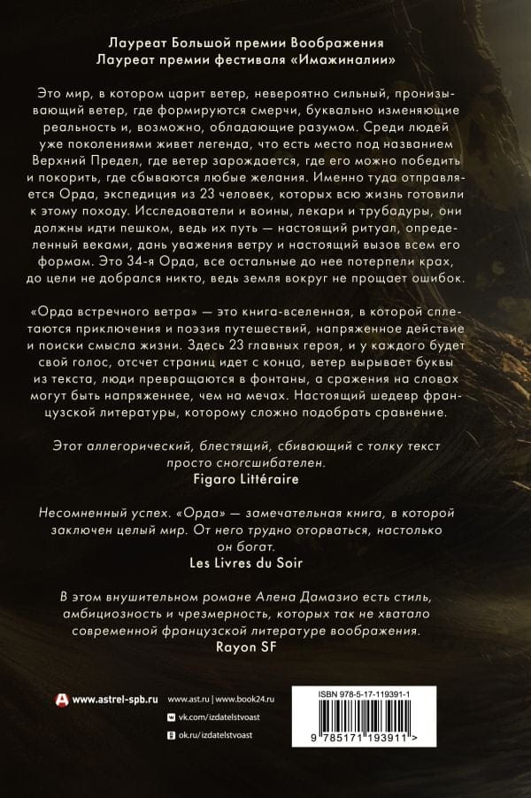 Šī ir pasaule, kurā valda vējš, neticami spēcīgs, caururbjošs vējš, kurā veidojas tornado, kas burtiski maina realitāti un, iespējams, apveltīts ar intelektu. Cilvēku vidū jau paaudzēm ilgi dzīvo leģenda, ka ir vieta, ko sauc par Augšējo robežu, kur rodas vējš, kur to var uzvarēt un iekarot, kur piepildās visas vēlmes. Tur dodas Orda, 23 vīru ekspedīcija, kas visu mūžu gatavojusies šim karagājienam. Pētniekiem un karotājiem, dziedniekiem un trubadūriem, viņiem jādodas ceļā kājām, jo viņu ceļojums ir īsts gadsimtu noteikts rituāls, veltījums vējam un īsts izaicinājums visām tā formām. Šī ir 34. orde, visas pārējās pirms tās ir cietušas neveiksmi, neviens nav sasniedzis mērķi, jo apkārtējā zeme kļūdas nepiedod. "Galvaskausa orde" ir grāmata-visums, kurā savijas piedzīvojumi un ceļojumu dzeja, spraiga darbība un dzīves jēgas meklējumi. Grāmatā ir 23 galvenie varoņi, un katram būs sava balss, lappušu skaitīšana rit no beigām, vējš izrauj burtus no teksta, cilvēki pārvēršas strūklakās, un cīņas uz vārdiem var būt spraigākas nekā uz zobeniem. Īsts franču literatūras šedevrs, kam grūti atrast salīdzinājumu.