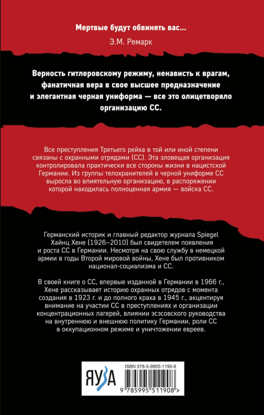 Visi Trešā reiha noziegumi vienā vai otrā mērā ir saistīti ar Drošības vienībām (SS). Šī draudīgā organizācija kontrolēja gandrīz visus dzīves aspektus nacistiskajā Vācijā. No miesassargu grupas melnās uniformās SS pārtapa par ietekmīgu organizāciju, kuras rīcībā bija pilnvērtīga armija – SS karaspēks. Vācu vēsturnieks un žurnāla "Spiegel" galvenais redaktors Heincs Hēne (1926–2010) bija liecinieks SS rašanās un izaugsmei Vācijā. Neskatoties uz dienestu Vācijas armijā Otrā pasaules kara laikā, Hēne bija nacionālsociālisma un SS pretinieks.