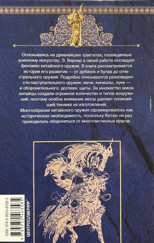 Edvarda Vernera unikālā grāmata pēta dažādu ieroču veidu attīstību Ķīnā. Balstoties uz seniem tekstiem, Verners pēta tādus ieročus kā nūjas, vāles, kaujas cirvjus, šķēpus, pīķus, zobenus, lokus, arbaletus, balistas, šautenes, materiālus, no kuriem tie tika izgatavoti, to izmantošanu kaujā un aizsargbruņas. Autors ieved lasītāju ķīniešu militārās mākslas pasaulē, izceļot dažādu ķīniešu ieroču veidu nianses.