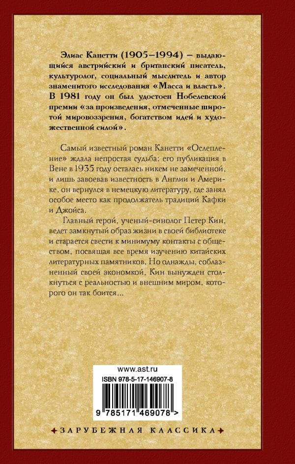 Kaneti slavenākais romāns „Blindings" gaidīja grūtu likteni: tā publikācija Vīnē 1935. gadā palika nepamanīta, un tikai pēc slavas iegūšanas Anglijā un Amerikā viņš atgriezās vācu literatūrā, kur ieņēma īpašu vietu kā Kafkas un Džoisa tradīciju pēctecis. Galvenais varonis, sinologs Pīters Kīns, savā bibliotēkā vada slēgtu dzīvesveidu un cenšas mazināt kontaktus ar sabiedrību, visu laiku veltot ķīniešu literāro pieminekļu pētīšanai. Bet kādu dienu, viņa mājturis, Kīns ir spiests saskarties ar realitāti un ārpasauli viņš tik daudz baidās