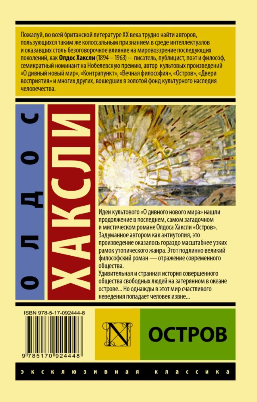 Kulta klasikas "Brīnišķīgā jaunā pasaule" idejas tika turpinātas Oldoss Hakslijs savā pēdējā, visnoslēpumainākajā un mistiskākajā romānā "Sala". Autora iecerēta kā distopija, šis darbs izrādījās daudz ambiciozāks nekā utopiskā žanra šaurās robežas. Šis patiesi lieliskais filozofiskais romāns ir mūsdienu sabiedrības atspoguļojums.