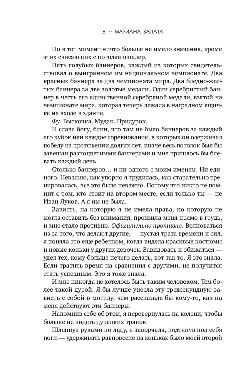 Viņš ir čempions. Viņa ir zaudētāja. Un viņi viens otru ienīst. Džesmina Santosa nevar iedomāties dzīvi bez daiļslidošanas, taču viņa nekad nav izcīnījusi pirmo vietu... Turklāt viņas partneris viņu pamet, un Džesmina ir izmisumā. Līdz brīdim, kad viņai rodas iespēja veidot pāri ar Ivanu Lukovu, savas labākās draudzenes brāli un īstu daiļslidošanas zvaigzni. Ir tikai viens "bet": Jesmina nevar paciest Ivanu. Un viņš arī nespēj viņu. Viņu tandēms sola daudz, daudz cīņu. Taču Jesmina nolemj riskēt. Vai viņa patiešām ir gatava darīt jebko, lai gūtu panākumus? Apdedzinoši atdzesējošs stāsts "no naida līdz mīlestībai" no Slooburn karalienes Mariānas Zapatas.