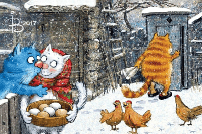 Skaista un smieklīga pastkarte ar ziliem kaķiem noteikti iepriecinās saņēmēju, jo Irinas Zenjuka zīmējumi ir ļoti mīļi un pārdomāti.