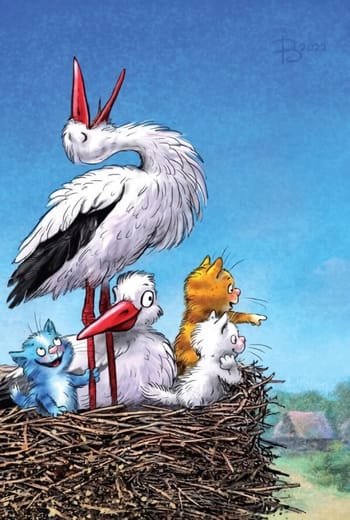 Pastkarte. Zili kaķi. Stārķi un kaķēni.