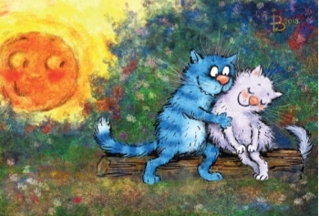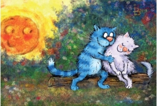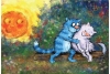 Krāšņā un smieklīgā pastkarte ar ziliem kaķiem noteikti iepriecinās saņēmēju, jo Irinas Zenjuka zīmējumi ir ļoti mīļi un pārdomāti.