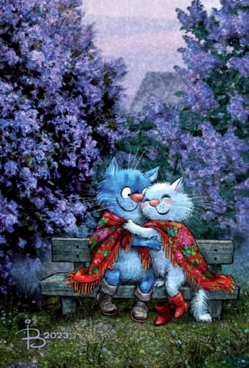 Krāšņā un smieklīgā pastkarte ar ziliem kaķiem noteikti iepriecinās saņēmēju, jo Irinas Zenjuka zīmējumi ir ļoti mīļi un pārdomāti.