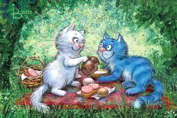 Pastkarte. Zili kaķi. Brokastis uz zāles.