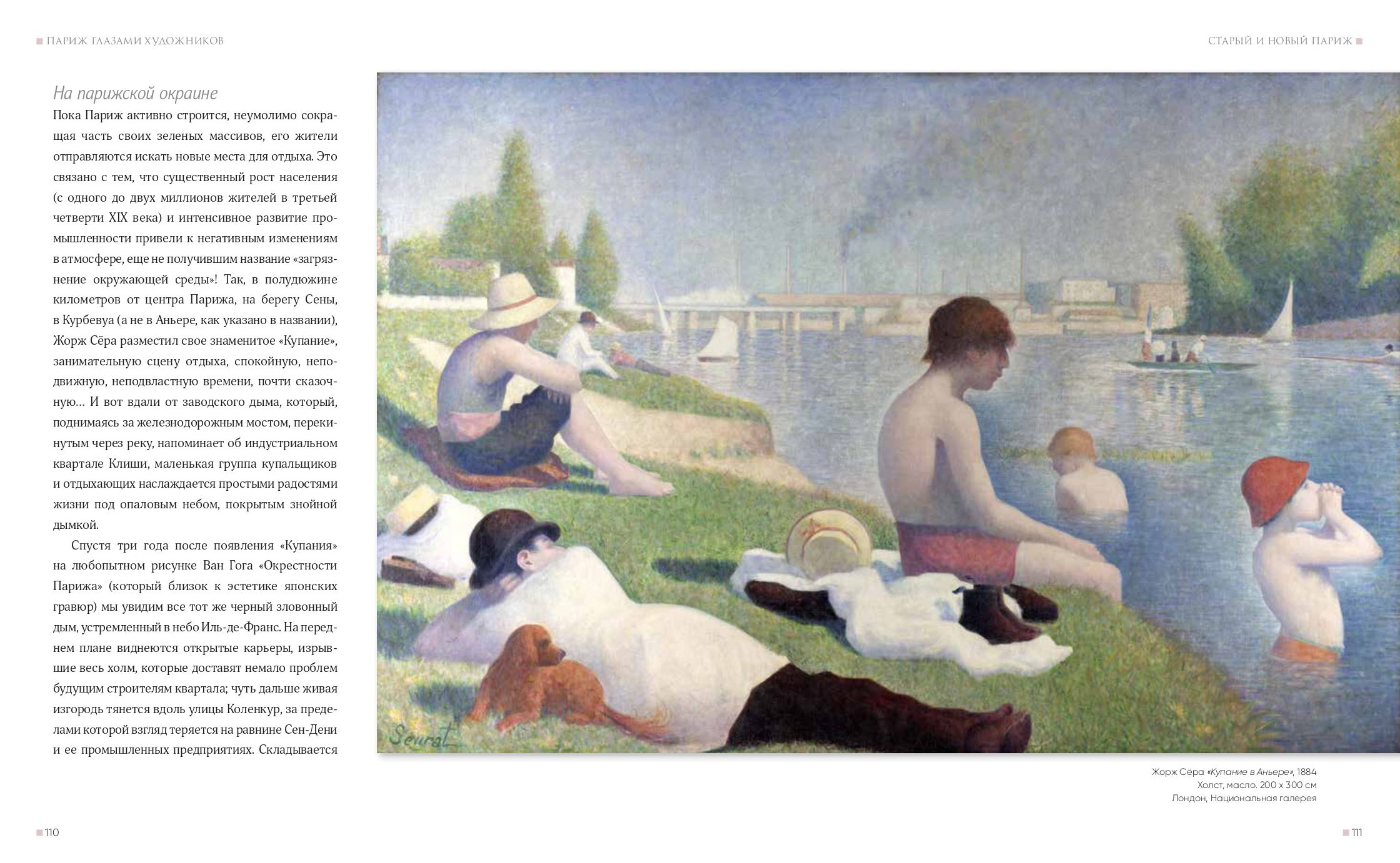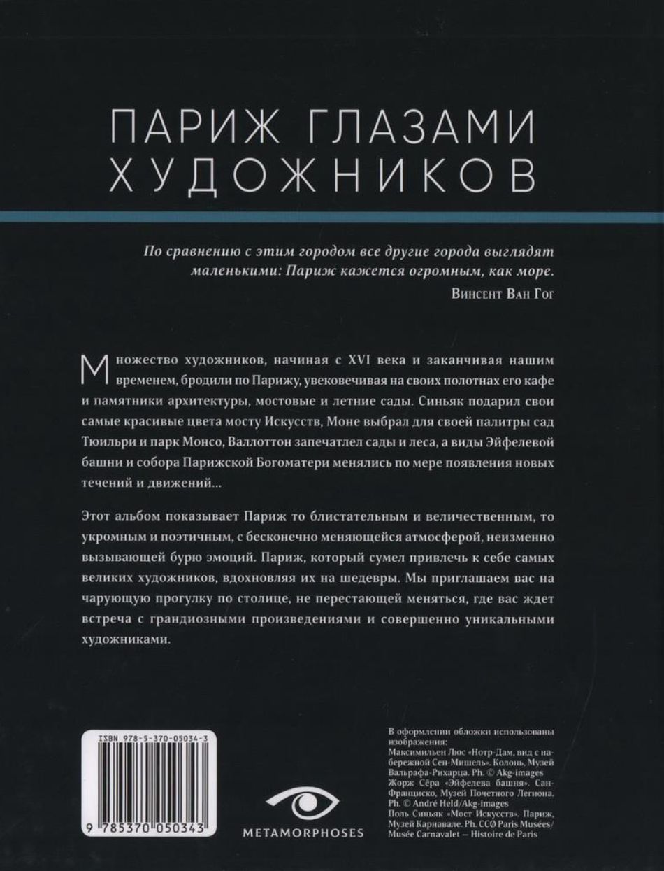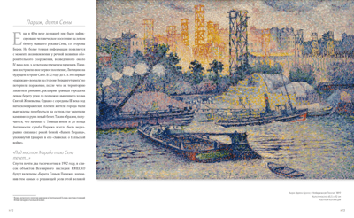 No 16. gadsimta līdz mūsdienām neskaitāmi mākslinieki ir klejojuši pa Parīzi, savos audeklos iemūžinot tās kafejnīcas un arhitektūras pieminekļus, bruģētās ielas un vasaras dārzus. Žinaks savas skaistākās krāsas atnesa uz Mākslas tiltu (Pond des Arts), Monē par paleti izvēlējās Tilerī dārzu un Monso parku, Valotons iemūžināja dārzus un mežus, un Eifeļa torņa un Notrdamas katedrāles skati attīstījās līdz ar jaunu kustību un kustību rašanos. Šis albums attēlo Parīzi reizēm spožu un majestātisku, reizēm noslēgtu un poētisku, ar nebeidzami mainīgu atmosfēru, kas neizbēgami izraisa emociju vētru. Parīze, kurai ir izdevies piesaistīt izcilākos māksliniekus, iedvesmojot viņus radīt šedevrus. Aicinām jūs burvīgā pastaigā pa nepārtraukti mainīgo galvaspilsētu, kur jūs sastapsiet lieliskus darbus un unikālus māksliniekus.