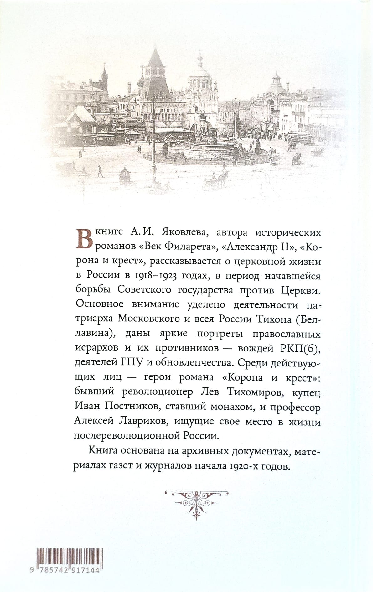 A. I. Jakovļevs, vēsturisko romānu "Filareta laikmets", "Aleksandrs II" un "Kronja un krusts" autors, hronizē baznīcas dzīvi Krievijā no 1918. līdz 1923. gadam, Padomju valsts sākotnējās cīņas pret Baznīcu laikā. Grāmata koncentrējas uz Maskavas un visas Krievijas patriarha Tihona (Bellavina) darbību, piedāvājot spilgtus pareizticīgo hierarhu un viņu pretinieku — Krievijas Komunistiskās partijas (boļševiku) līderu, GPU aktīvistu un renovācijas piekritēju — portretus. Starp varoņiem ir "Kronja un krusta" varoņi: bijušais revolucionārs Ļevs Tihomirovs, tirgotājs Ivans Postņikovs, kurš kļuva par mūku, un profesors Aleksejs Lavrikovs, kuri visi meklē savu vietu pēcrevolūcijas Krievijā.