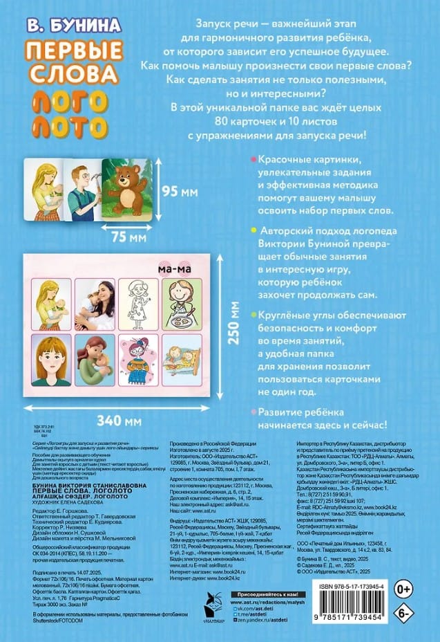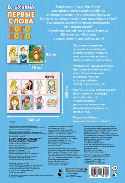 Visi vecāki sapņo dzirdēt savus mazos izrunājam savus pirmos apzinātos vārdus. Ko darīt, ja "mamma", "tētis" vai "dod" vienkārši neizrunājas? Logopēde Viktorija Bunina ir izstrādājusi unikālu runas stimulācijas tehniku. Vairāk nekā 10 000 pateicīgu vecāku to jau ir novērtējuši kā efektīvu. Šī rokasgrāmata ir balstīta uz šo tehniku un ir paredzēta, lai palīdzētu stimulēt bērnu ar runas attīstības traucējumiem pirmos vārdus. Uzdevumi ir izstrādāti, ņemot vērā runas pamata psiholoģiskos mehānismus, efektīvi stimulējot bērnu vecumā no 1 līdz 3 gadiem runas attīstību. Aizraujošā spēle "Speech Lotto" aizraus pat visnemierīgākos bērnus. Metodoloģiski ieteikumi ar vienkāršiem un skaidriem soļu aprakstiem un video norādījumiem ar papildu spēlēm nodrošina augstas kvalitātes rezultātus. Komplektā ietilpst 10 lapas un 80 kartītes ar noapaļotiem stūriem ērtā un praktiskā mapē.