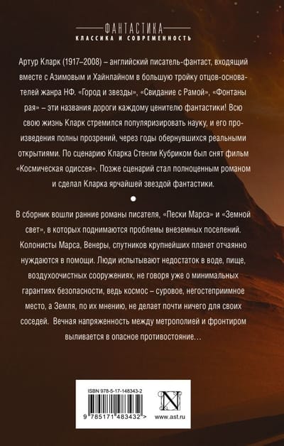 Artūrs K. Klārks (Arthur C. Clarke, 1917-2008) bija angļu rakstnieks, kurš kopā ar Asimovu un Heinleinu ir viens no trim lielajiem NF žanra pamatlicējiem. "Pilsēta un zvaigznes", "Randiņš ar Rāmu", "Paradīzes strūklakas" - šie izdevumi ir tuvi ikvienam zinātniskās fantastikas cienītājam! Visu mūžu Klārks centās popularizēt zinātni, un viņa darbi ir pilni atziņu, kas pēc gadiem pārtapa reālos atklājumos. Pēc Klārka scenārija motīviem Stenlijs Kubriks uzņēma filmu "Kosmosa odiseja". Vēlāk scenārijs kļuva par pilnvērtīgu romānu un padarīja Klārku par spožāko zinātniskās fantastikas zvaigzni.