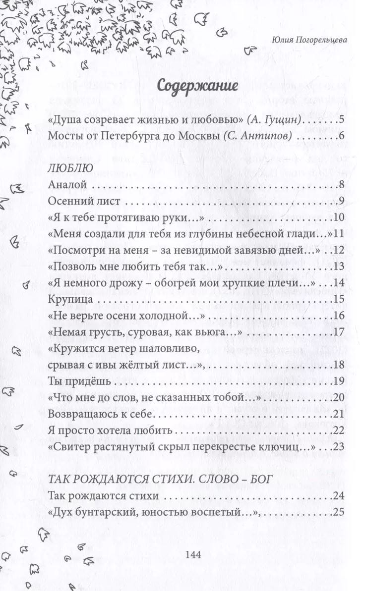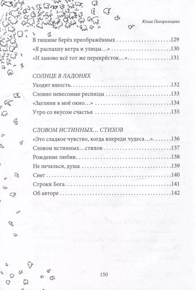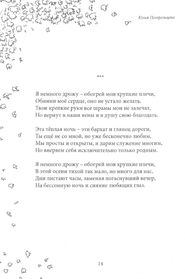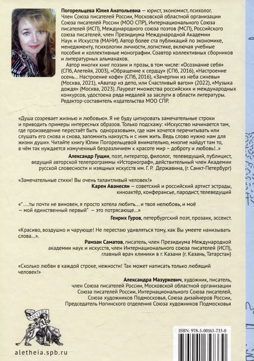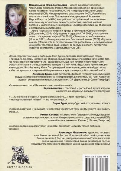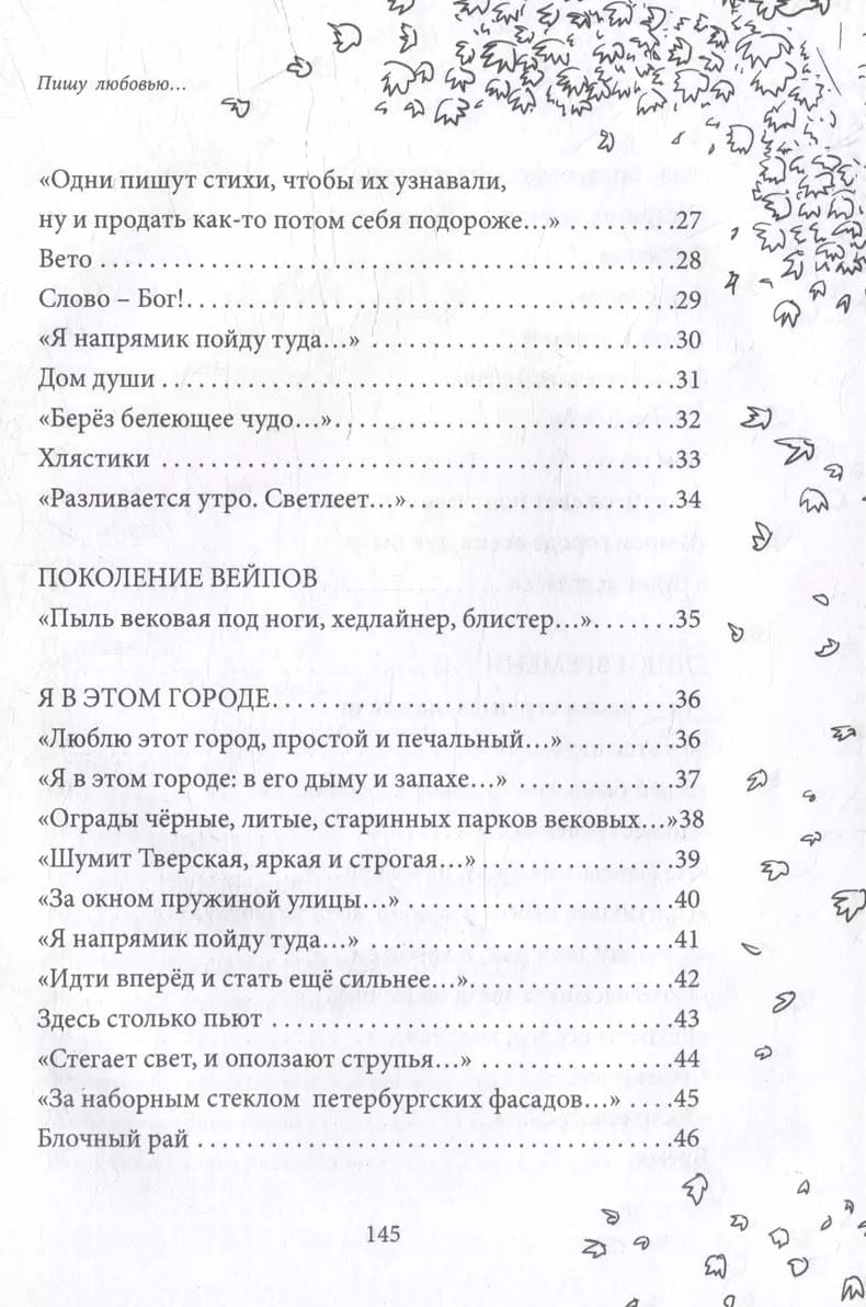 "Es rakstu ar mīlestību" - dzejoļu grāmata par mīlestību - mīlestību juteklisku un kaislīgu, maigu un cildenu, mīlestību, kuras avots var būt mīļotā cilvēka acis, balss, smarža, apbrīnas, ticības un uzticības emociju asums vai upju līkumu elegance, gaisma, kas smalki izlaužas cauri arkai, mīļotās pilsētas - pilsētas, kurā dzīvo mīlestība - vitrāžu atspulgs. Dzimtā pēterburgiete Jūlija Pogoreļceva rada īpašu poētisku audeklu, kurā jūtama pilsētas atmosfēra, tās dzīvīgums, gadsimtu vēsture, varenība un neatkārtojamais Sanktpēterburgas gars, un piepilda to ar mīlestību.