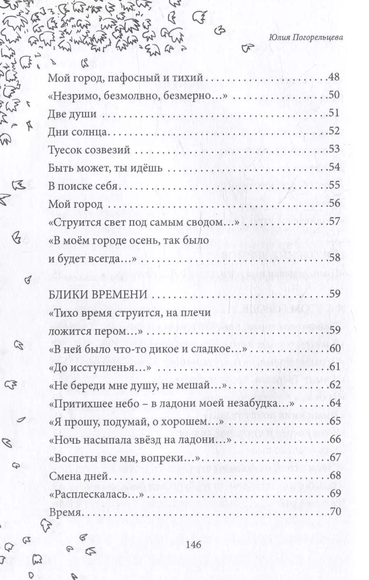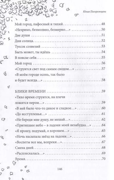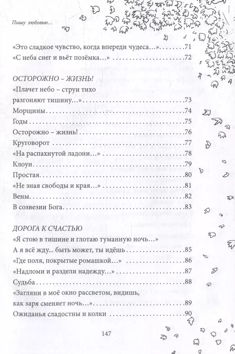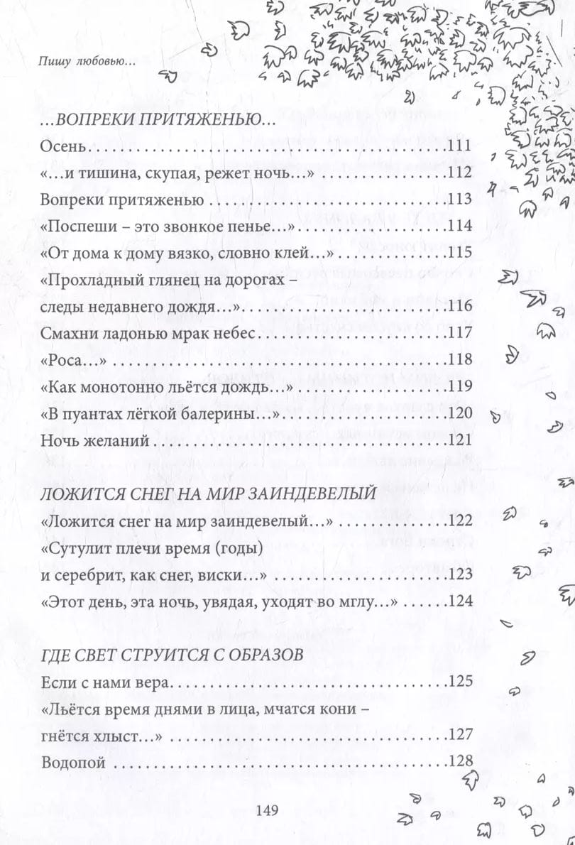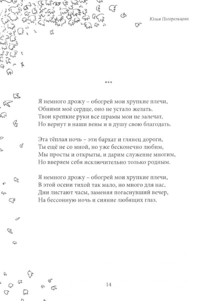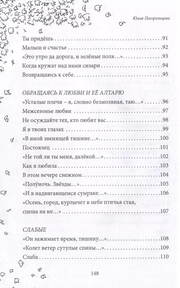 "Es rakstu ar mīlestību" - dzejoļu grāmata par mīlestību - mīlestību juteklisku un kaislīgu, maigu un cildenu, mīlestību, kuras avots var būt mīļotā cilvēka acis, balss, smarža, apbrīnas, ticības un uzticības emociju asums vai upju līkumu elegance, gaisma, kas smalki izlaužas cauri arkai, mīļotās pilsētas - pilsētas, kurā dzīvo mīlestība - vitrāžu atspulgs. Dzimtā pēterburgiete Jūlija Pogoreļceva rada īpašu poētisku audeklu, kurā jūtama pilsētas atmosfēra, tās dzīvīgums, gadsimtu vēsture, varenība un neatkārtojamais Sanktpēterburgas gars, un piepilda to ar mīlestību.