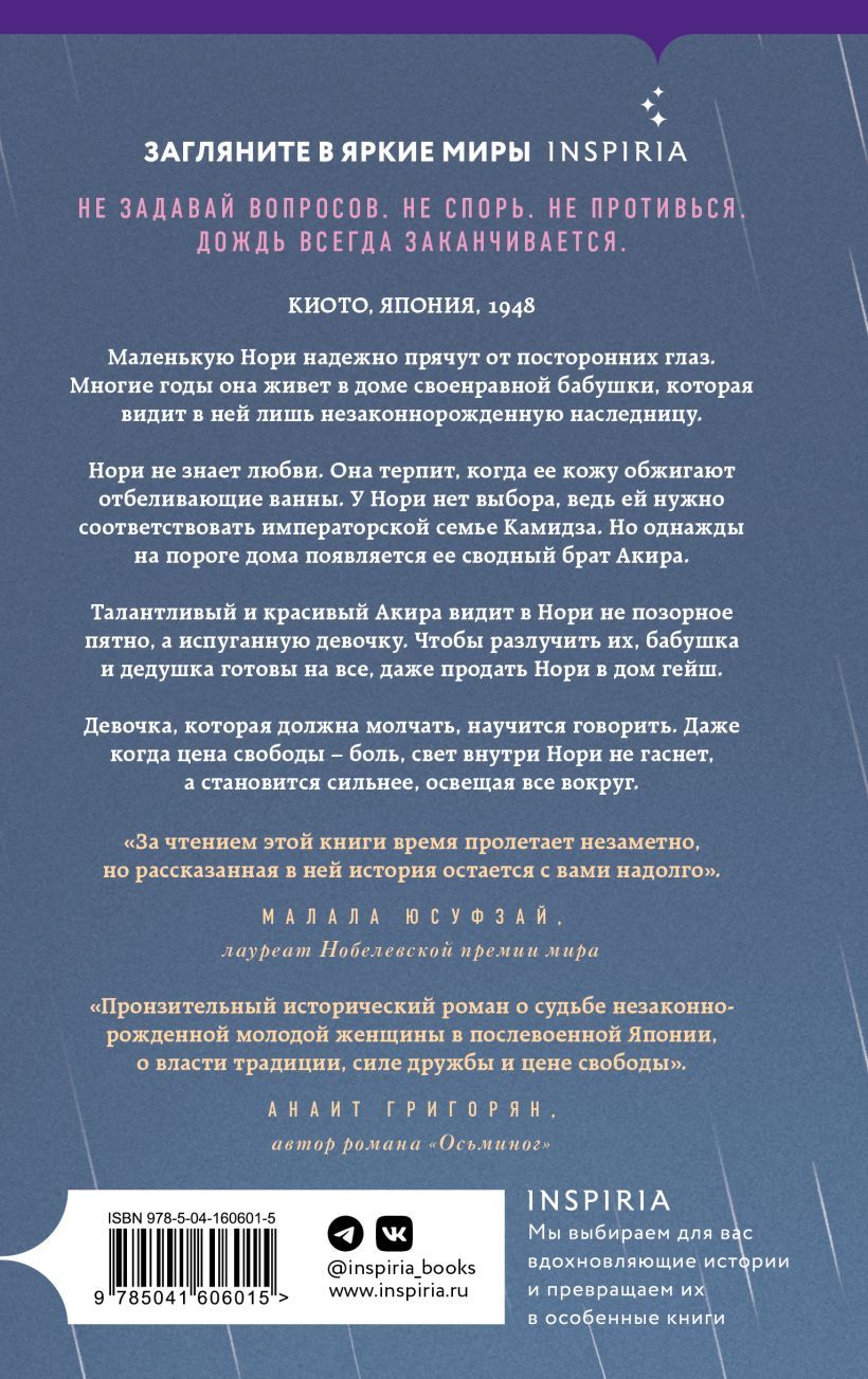 Šis ir stāsts par Nori, kura nepazina mīlestību, līdz viņas dzīvē ienāca vecākais brālis Akira. Tagad Nori ir ģimene - īsta, laipna, mīloša ģimene - un visa pasaule priekšā. Neuzdodiet jautājumus. Nestrīdieties. Nespiedies. Lietus vienmēr beidzas. Kioto, Japāna, 1948. gads. Mazais Nori ir droši paslēpies no ziņkārīgo acīm. Daudzus gadus viņa dzīvo savas nevaldāmās vecmāmiņas mājā, kura viņu uzskata tikai par ārlaulības mantinieci. Nori nepazīst mīlestību. Viņa pārcieš ādas apdegumus balinātāju vannās. Nori nav izvēles, jo viņai ir jāpielāgojas Kamijo imperatora ģimenei. Taču kādu dienu viņas pusbrālis Akira parādās pie viņas durvīm. Talantīgs un izskatīgs Akira redz Nori nevis kā apkaunojošu traipu, bet gan kā nobijušos meiteni. Lai viņus šķirtu, vecvecāki ir gatavi uz visu, pat pārdot Nori geišu namam. Meitene, kurai vajadzētu klusēt, iemācīsies runāt. Pat tad, kad brīvības cena ir sāpes, gaisma Nori iekšienē neapsīkst, bet kļūst arvien spēcīgāka, izgaismojot visu ap viņu.