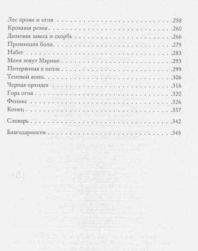 "Miglas liesmas" ir aizraujoša Āzijas fantāzija par upurēšanos, godu, mīlestību un ģimenes vērtībām. Tā ir kā "Mulana" un "Troņu spēle". No pasaules bestselleru romānu "Skaistums un dusmas" un "Rītausma" autores. Mariko Hattori vienmēr zināja, ka viņas dzīves jēga ir apprecēties. Politiska laulība ar troņa mantinieku viņas ģimenei nestu godu. Tiklīdz viņai apritēja septiņpadsmit gadi, viņa tika nosūtīta uz tikšanos ar savu līgavaini. Taču ceļā uz pili viņai uzbruka bīstamo algotņu grupējums - Melnais klans. Mariko brīnumainā kārtā izdevās izbēgt. Pārģērbusies vīriešu drēbēs, viņa nolemj atriebties un noskaidrot to cilvēku vārdus, kuri vēlējās viņas nāvi. Tas ir vienīgais veids, kā viņa var izpelnīties imperatora cieņu. Bet ko darīt, ja, pievienojoties Melnajam klanam, viņa sapratīs savu patieso mērķi un nevēlēsies atgriezties pie iepriekšējās paklausīgas meitas dzīves?