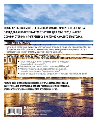 Izpētiet Ziemeļu galvaspilsētu caur interesantiem tās laukumu stāstiem! Šī aizraujošā, bagātīgi ilustrētā grāmata ievedīs jūs tādu slavenu vietu kā Admiralitātes laukums, Pils laukums, Svētā Īzaka laukums noslēpumos, kā arī pastāstīs par tikpat nozīmīgām vietām pilsētas nomalēs.