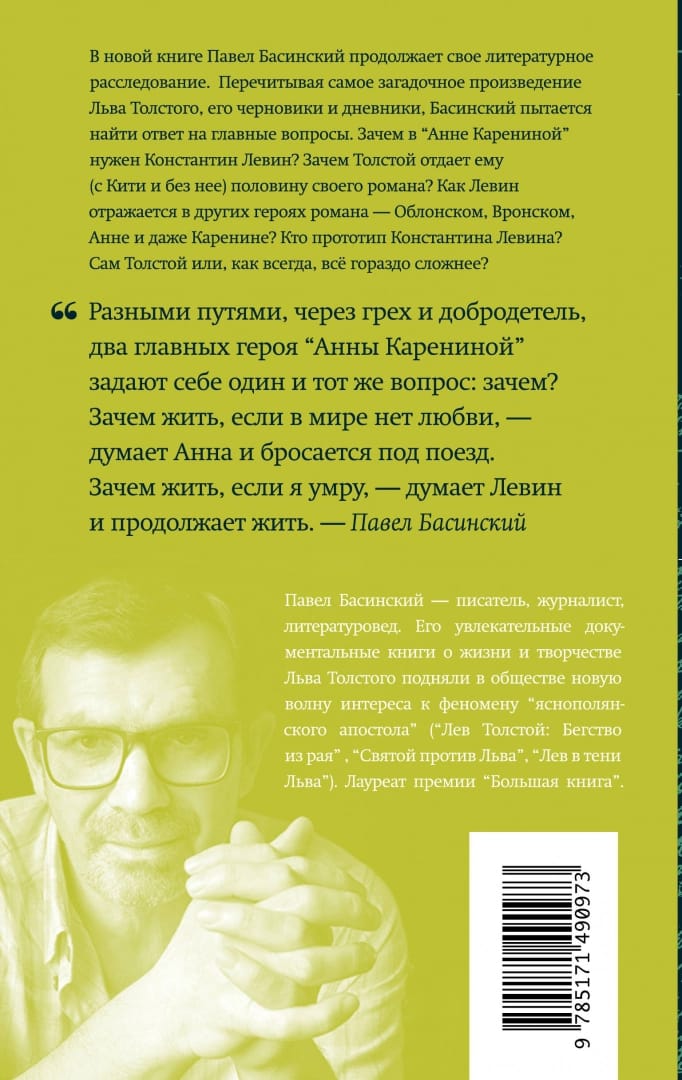 Savā jaunajā grāmatā "Konstantīna Levina patiesais stāsts" Pāvels Basinskis turpina literāro izmeklēšanu. Pārlasot Ļeva Tolstoja mīklaināko darbu, viņa melnrakstus un dienasgrāmatas, Basinskis cenšas rast atbildi uz galvenajiem jautājumiem. Kāpēc "Annai Kareņinai" ir vajadzīgs Konstantīns Leviņš? Kāpēc Tolstojs dod viņam (ar vai bez Kiti) pusi sava romāna? Kā Levins atspoguļojas citos romāna varoņos - Obļonskā, Vronski, Annā un pat Kareninā? Kas ir Konstantīna Levina prototips? Pats Tolstojs vai, kā vienmēr, tas ir daudz sarežģītāk? Grāmata ilustrēta ar fotogrāfijām no Ļeva Tolstoja Valsts muzeja un Jasnaja Poļjanas muižas muzeja arhīviem.