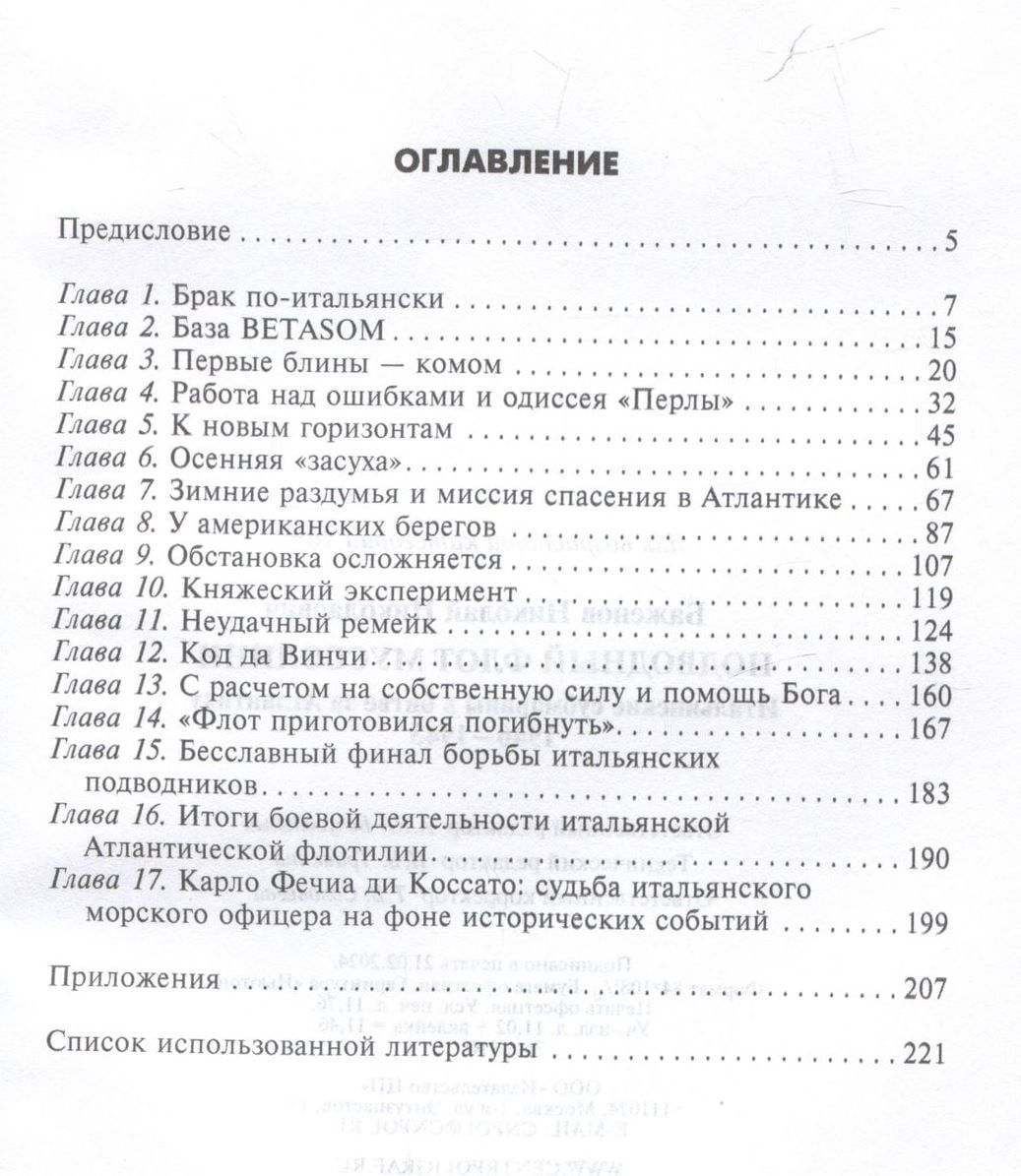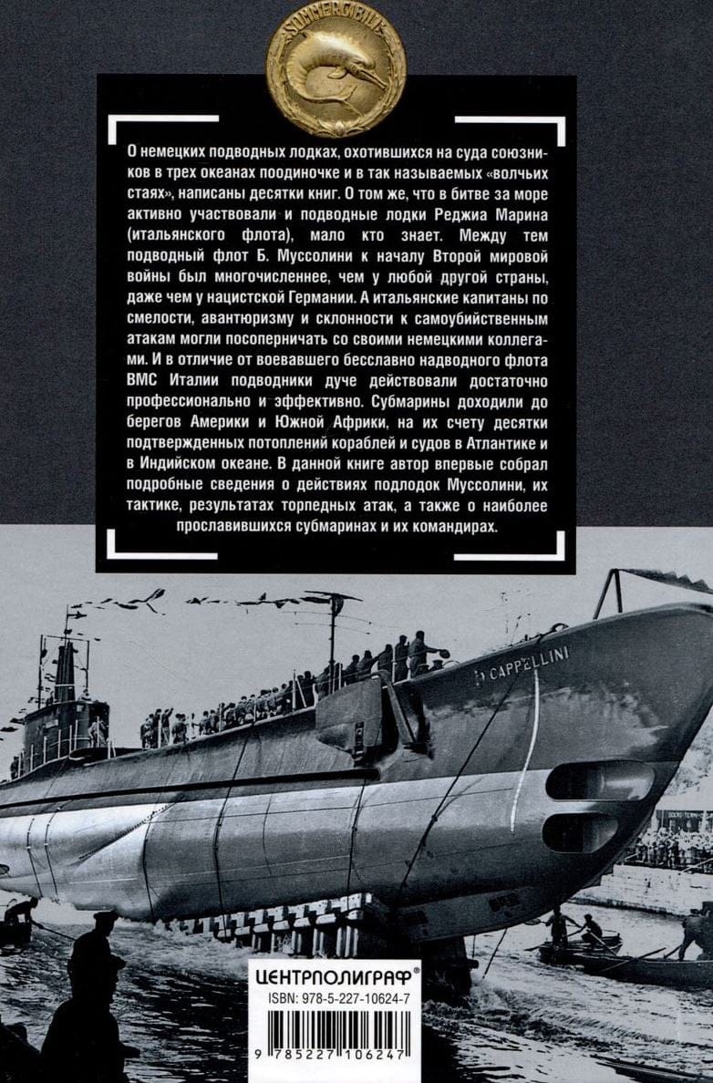 Ir sarakstītas desmitiem grāmatu par vācu zemūdenēm, kas medīja sabiedroto kuģus trijos okeānos, gan individuāli, gan tā sauktajos "vilku baros". Tikai retais zina, ka cīņā par jūru aktīvi piedalījās arī Reggia Marina (Itālijas flotes) zemūdenes. Tikmēr Musolīni zemūdeņu flote Otrā pasaules kara sākumā bija lielāka nekā jebkurai citai valstij, pat nacistiskajai Vācijai. Un itāļu kapteiņi varēja sacensties ar saviem vācu kolēģiem drosmē, piedzīvojumu meklējumos un tieksmē uz pašnāvnieciskiem uzbrukumiem. Un atšķirībā no negodīgi cīnošās Itālijas Jūras spēku virszemes flotes, Duce zemūdenes rīkojās diezgan profesionāli un efektīvi. Zemūdenes sasniedza Amerikas un Dienvidāfrikas krastus, un tās bija atbildīgas par desmitiem apstiprinātu kuģu un kuģu nogrimšanu Atlantijas un Indijas okeānā. Šajā grāmatā autors pirmo reizi ir apkopojis detalizētu informāciju par Musolīni zemūdeņu rīcību, taktiku, torpēdu uzbrukumu rezultātiem, kā arī par slavenākajām zemūdenēm un to komandieriem.