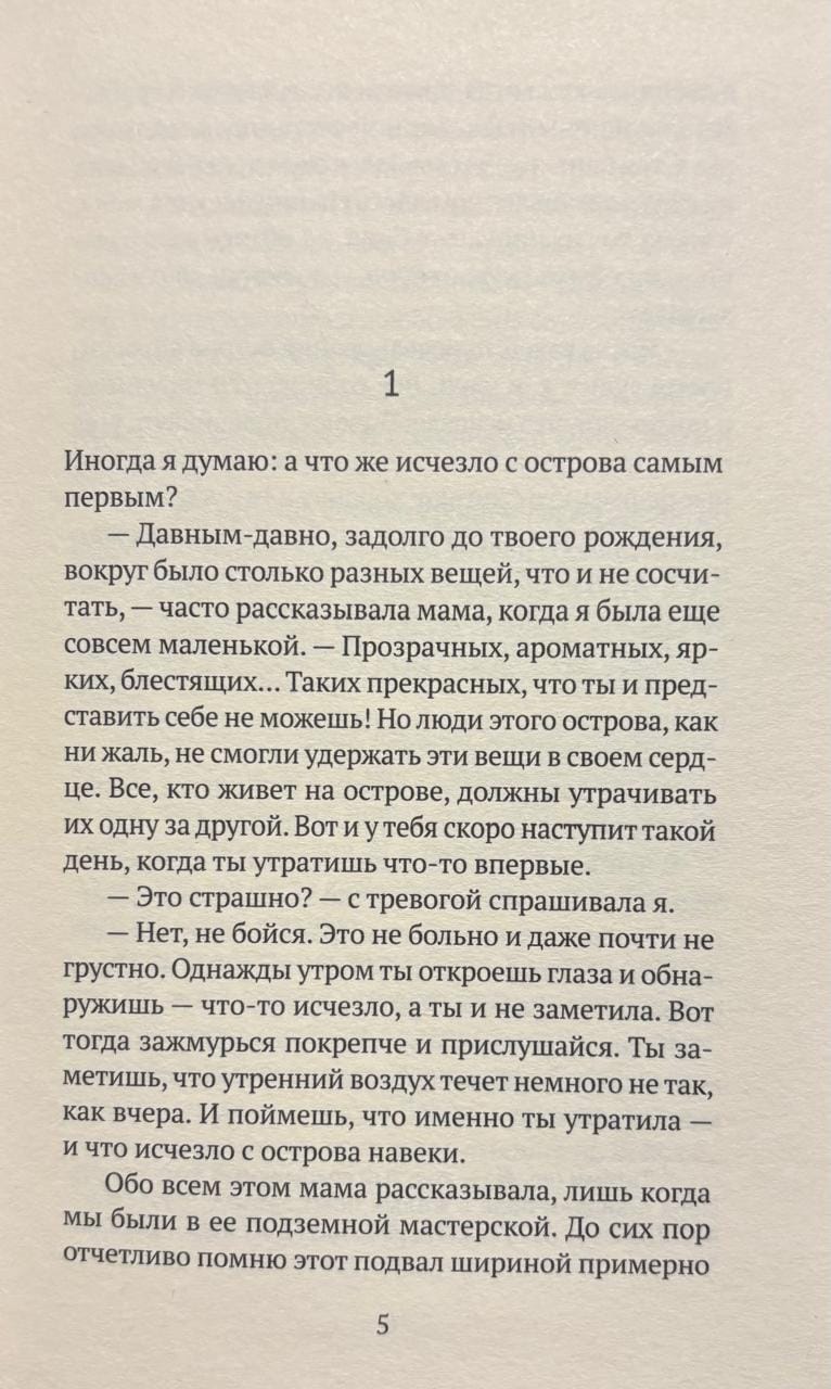 Šis romāns, kas sarakstīts 1994. gadā, ir mūžīgs. Tas pēta zaudējuma neizbēgamību un delikāto, tomēr spēcīgo saikni starp cilvēku un viņa atmiņu. Tas pēta atmiņas raksturīgo īpašību. Tas pēta, kā, ja atmiņa tiek atņemta cilvēkam, tās vietā paliek neaizpildāms tukšums. Atmiņa, kas bieži vien ietverta visvienkāršākajos ikdienas priekšmetos, piemēram, matu lentē, pasta zīmē, putnā, fotogrāfijā vai mutes harmonikā, ir šī nezinātniskā, tomēr fantastiskā darba galvenā varone, kura palete svārstās no sociālās satīras, utopijas līdz kafkiskai traģēdijai. Visiem Džordža Orvela "1984", Reja Bredberija "451 grāds pēc Fārenheita", Kobo Abes "Sieviete kāpās" un Haruki Murakami "Neierobežotās brīnumzemes" cienītājiem.
