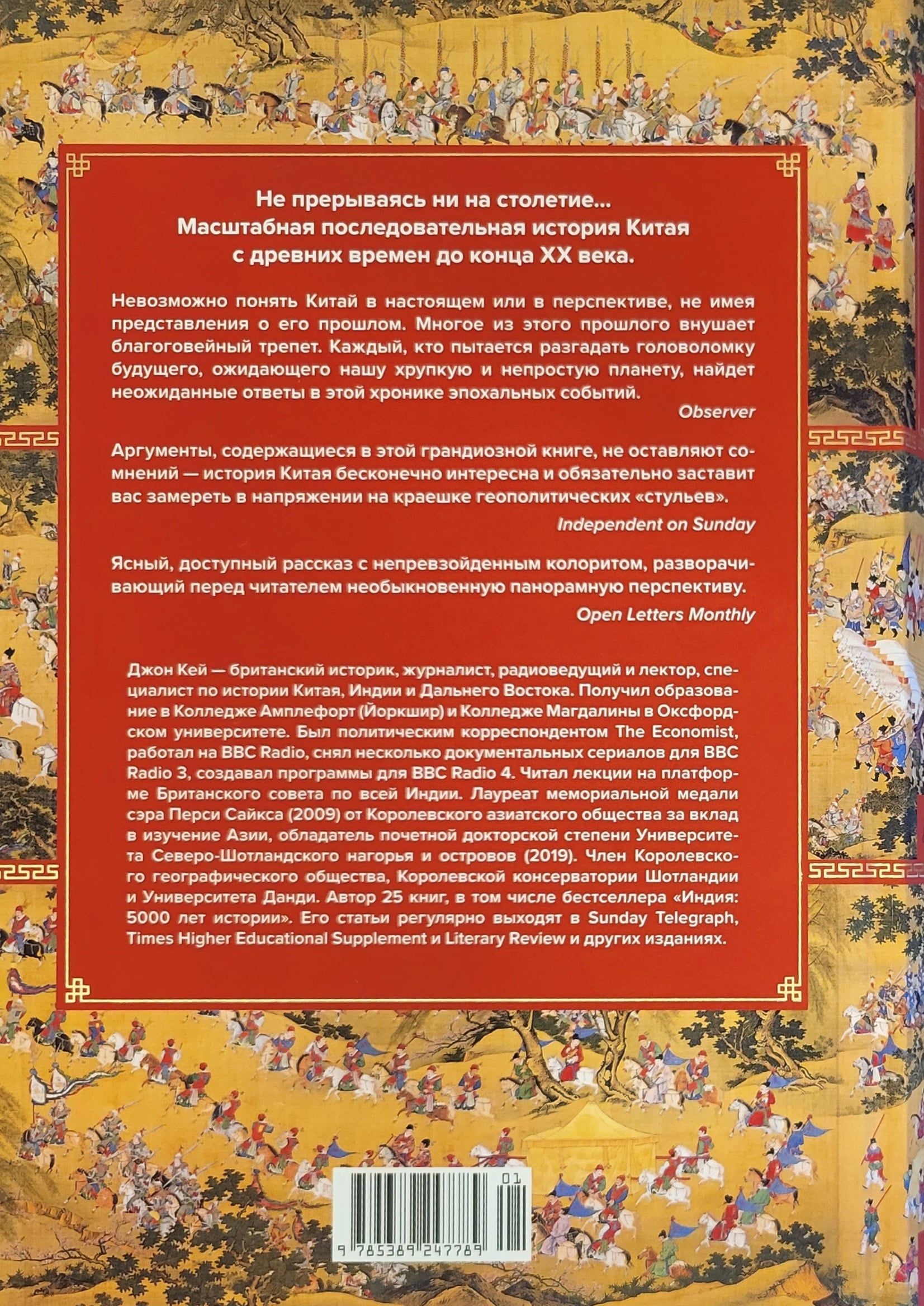 No pirmsrakstniecības perioda līdz 20. gadsimta beigām izcilais britu vēsturnieks Džons Kejs (John Kay) piedāvā plašu secīgu Ķīnas vēsturi. Šī grāmata, kas balstīta uz bagātīgiem arhīvu avotiem, tostarp nepublicētiem, jau ir atzīta par klasiku visā pasaulē. Detalizēts ievads sniedz ieskatu Ķīnas ģeogrāfijā, tās vēstures hronoloģijā un valodas īpatnībās, toponīmos un īpašvārdos. Turpmākajās nodaļās uzzināsiet visu par leģendārajiem pieciem imperatoriem, mītisko Sja valstību un pirmsimperiālajām Šan un Džou valstīm, bronzas un dzelzs laikmeta arheoloģiskajiem atradumiem, kaujas karaļvalstu periodu; Konfūcija ietekmi, Ķīnas apvienošanu, ko veica pirmais imperators Cjiņs Ši-Huandi, Cjiņs kultūras revolūciju, Hanas valdīšanas uzplaukumu un sabrukumu, Sui, Tang un Song dinastiju valdīšanu, piecas impērijas un desmit valstis, kā arī Ming dinastijas triumfu un krišanu. Tēmas ietver arī Mandžu iekarošanu, situāciju Dzungarijā, Siņdzjanā un Tibetā, Cvingu krīzi, Opija karu un Taipinu sacelšanās gaitu, Bokseru sacelšanos, valsts pāreju no impērijas uz republiku, Krievijas-Japānas, Pirmā un Otrā pasaules kara notikumus, kā arī Mao Dzeduna kultūras revolūciju. Izdevums ar pamatīgu uzziņu materiālu, krāsainiem ielikumiem, kartēm un tabulām būs interesants plašam lasītāju lokam. "Šī grāmata ir veidota, lai apmierinātu neatliekamu vajadzību - sniegt lasītājam pārskatu par Ķīnas vēsturi, kuras izpratnei nav nepieciešama iepriekšēja iepazīšanās ar šo tēmu vai ķīniešu valodas zināšanas... Ķīnas vēsture ir diezgan gara un kultūra - diezgan sarežģīta. Es no sirds ceru, ka lasītāju pūles beigās tiks bagātīgi atalgotas." (Džons Kejs)