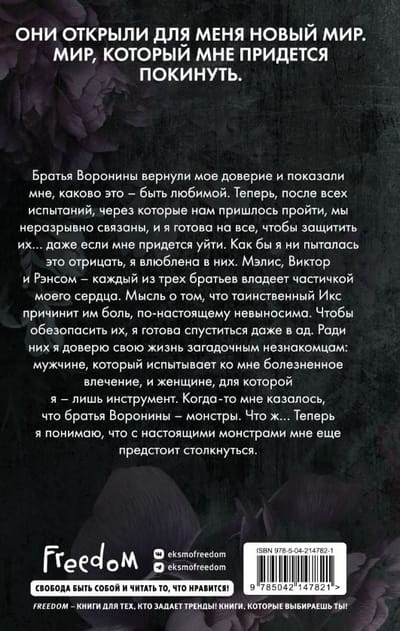 Brāļi Voroņi atjaunoja manu uzticību un parādīja, kā ir būt mīlētam. Tagad, pēc visiem pārdzīvotajiem pārbaudījumiem, mēs esam nesaraujami saistīti, un esmu gatavs darīt jebko, lai viņus aizsargātu... pat ja man būs jāaiziet. Lai cik ļoti es censtos to noliegt, esmu viņos iemīlējusies. Malaiss, Viktors un Ransoms — katrs no trim brāļiem tur daļiņu manas sirds. Doma par to, ka noslēpumainais X viņiem nodara pāri, ir patiesi nepanesama. Lai viņus pasargātu, esmu gatavs doties pat ellē. Viņu dēļ es uzticēšu savu dzīvību noslēpumainiem svešiniekiem: vīrietim, kurš jūt pret mani slimīgu pievilcību, un sievietei, kurai esmu tikai instruments. Reiz man šķita, ka brāļi Voroņini ir monstri. Nu... Tagad es saprotu, ka man vēl jātiekas ar īstiem monstriem.