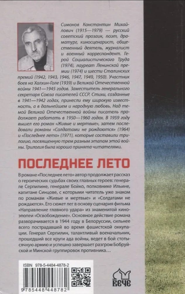 Savā romānā "Pēdējā vasara" autors turpina stāstu par savu galveno varoņu – ģenerāļa Serpilina, ģenerāļa Boiko, pulkveža Iļjina un kapteiņa Sincova – varonīgajiem likteņiem, kurus lasītājs jau pazīst no romāniem "Dzīvie un mirušie" un "Karavīri nedzimst". Viņa sižets kalpoja par pamatu filmai "Galvenā uzbrukuma virziens" no slavenā kinoeposa "Atbrīvošana". Romāna galvenā darbība norisinās 1944. gadā Baltkrievijā, kas visvairāk cieta nacistu okupācijas laikā. Ģenerālis Serpilins, talantīgs militārais vadītājs, kurš kara laikā ir piedzīvojis visus elles apļus, vada kaujā 100 000 vīru lielu armiju un veiksmīgi sakauj ienaidnieka Bobruiskas un Minskas grupējumus.